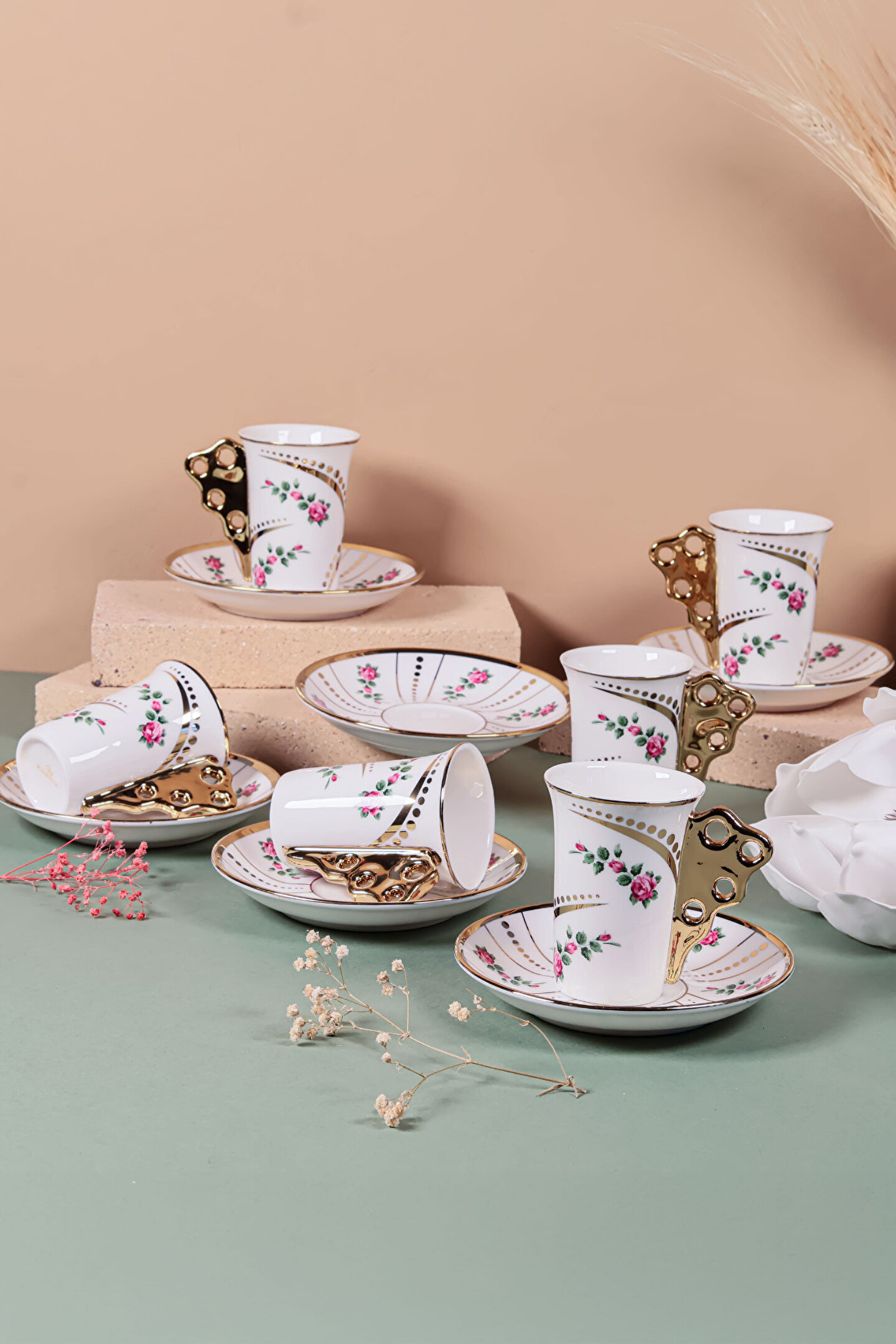 El işçiliği detaylarla süslenmiş bu özel fincan takımı, altın yaldızlı kulp tasarımı ve zarif çiçek desenleriyle sofralarınıza klasik bir ihtişam getiriyor.