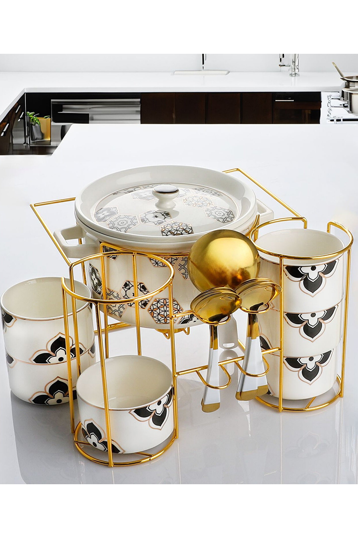Modern tasarımı, şık detayları ve altın metal standı ile sofralarınıza zarafet katacak 12 Parça Porselen Kahvaltı ve Sunum Seti ile tanışın.