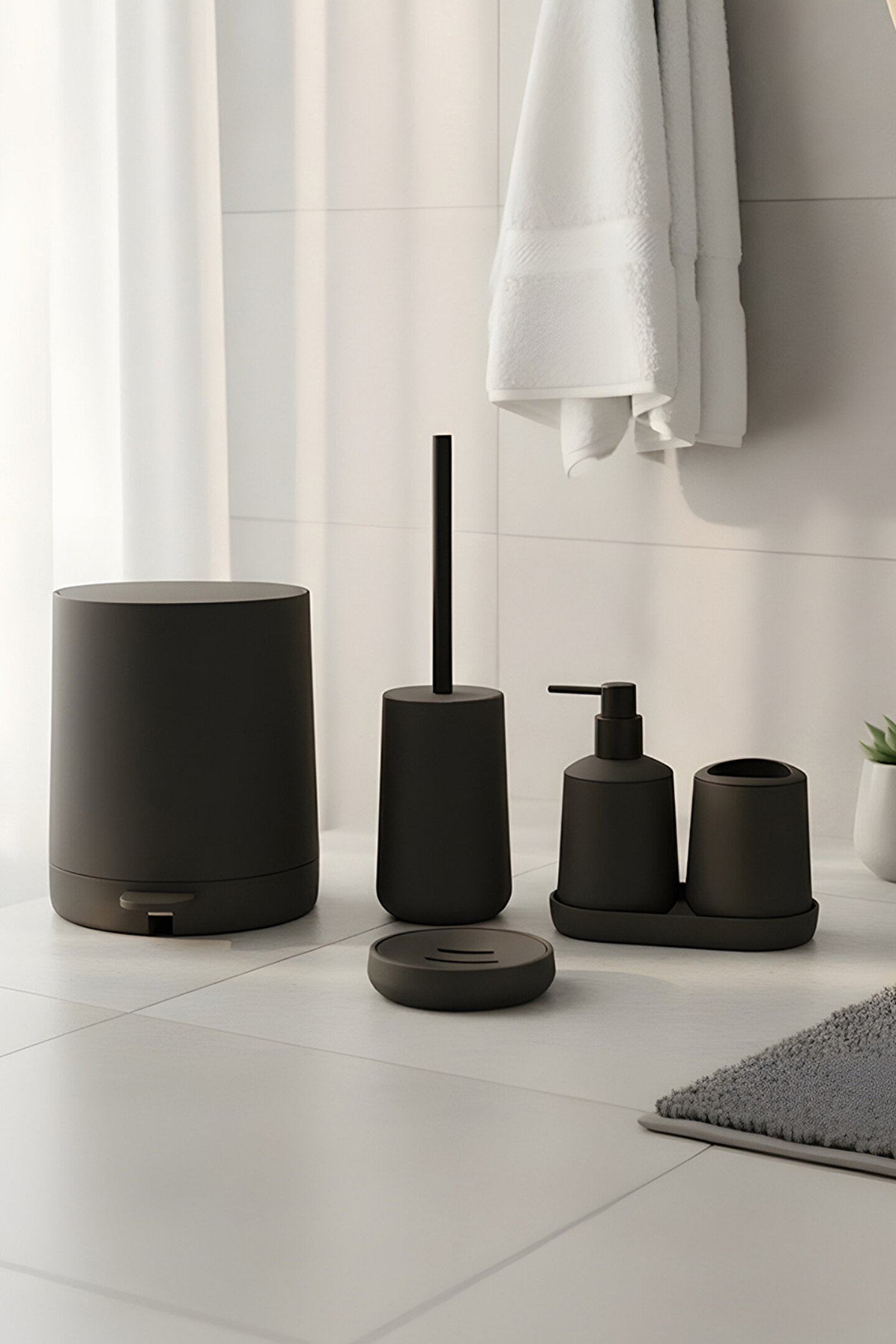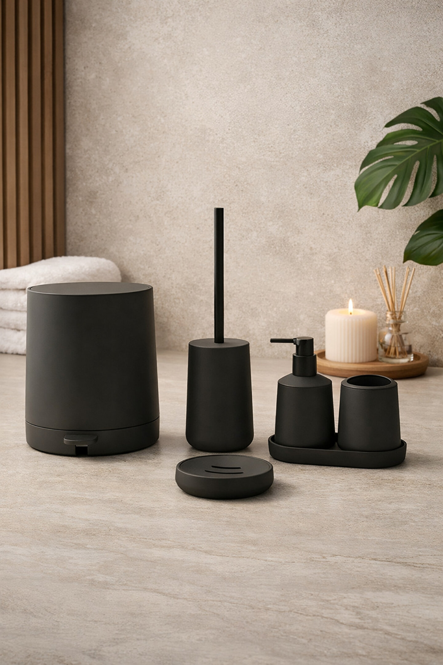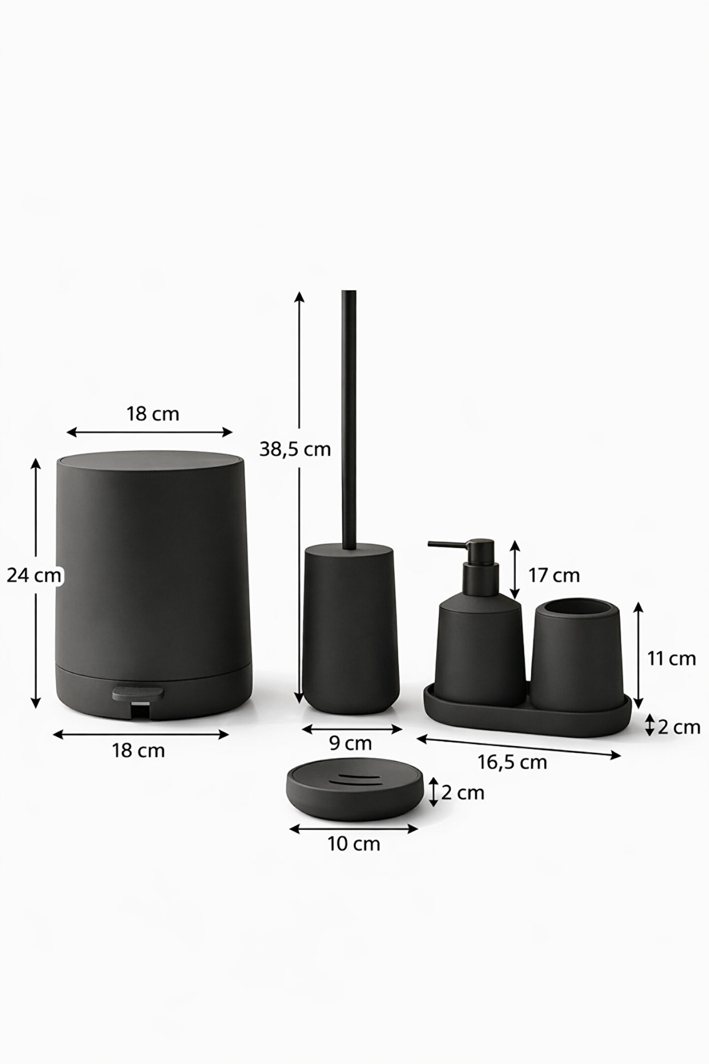 welcomein Mat Siyah 5 Parça Yuvarlak Banyo Seti – Kovası, Tuvalet Fırçası, Sıvı Sabunluk
