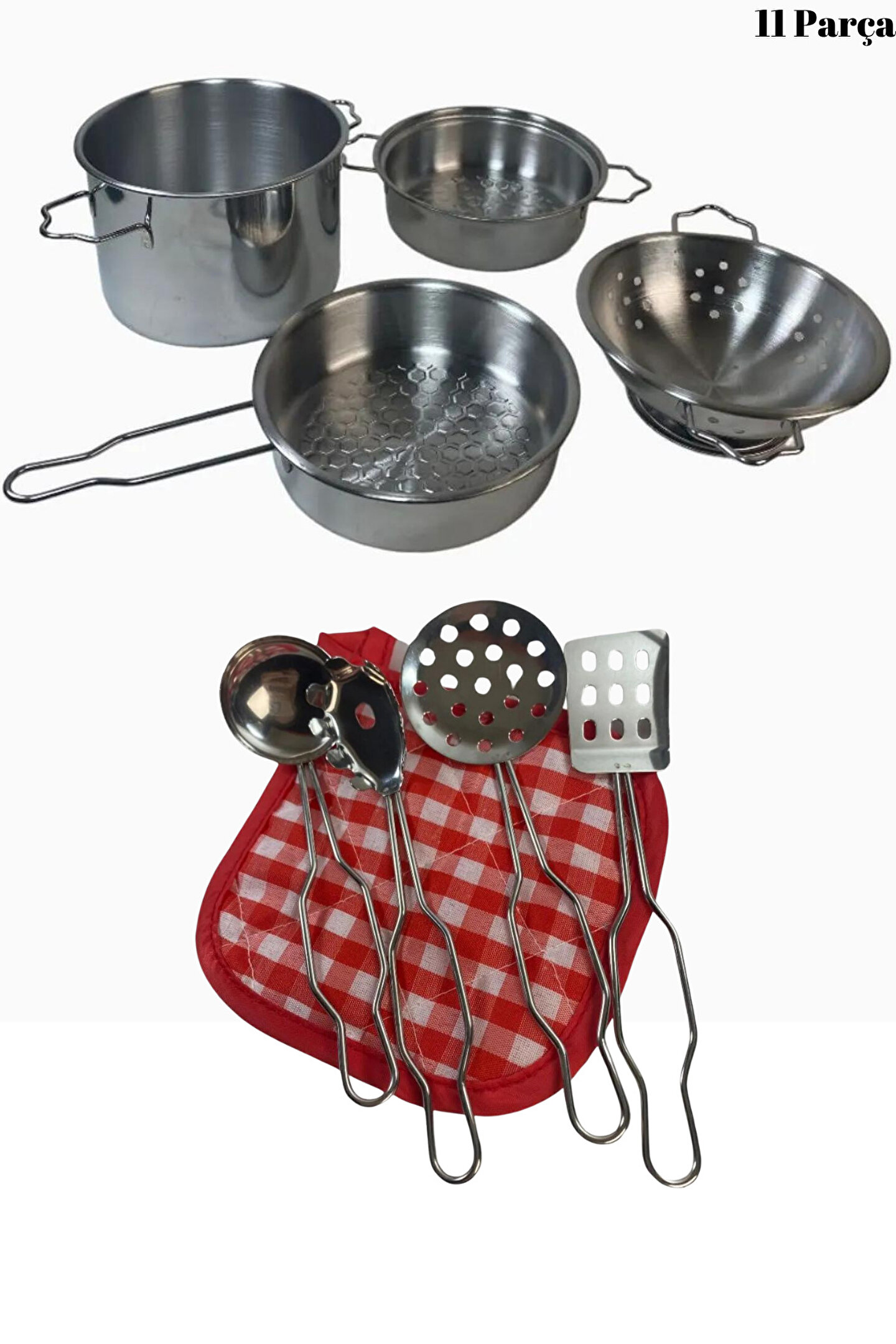 Metal Paslanmaz Çelik Oyuncak Tencere Seti 11 Parça Aksesuarlı - Evcilik Mutfak Oyuncak Tencere Seti, küçük şeflerin mutfağa olan ilgisini desteklemek ve eğlenceli bir oyun deneyimi sunmak amacıyla tasarlanmıştır. İşte bu oyuncak tencere setinin özellikleri madde madde: ; Malzeme:Set, yüksek kaliteli metal paslanmaz çelik malzemeden üretilmiştir. Bu sayede, çocuklar gerçek mutfak ekipmanlarına benzer bir deneyim yaşayabilirler. ; Parça Sayısı:Tencere seti, 11 farklı parçadan oluşmaktadır. Bu parçalar, çocukların hayal güçlerini kullanarak çeşitli yemekleri hazırlamalarına olanak tanır. ; Oyuncak Aksesuarlar:Set, mutfak oyunlarını daha eğlenceli hale getirmek için çeşitli aksesuarlar içerir. Bu aksesuarlar, çocukların yaratıcılıklarını geliştirmelerine yardımcı olabilir. ; Güvenli ve Dayanıklı:Paslanmaz çelik malzeme, setin dayanıklı ve uzun ömürlü olmasını sağlar. Aynı zamanda, oyuncak tencere seti çocuklar için güvenli bir şekilde tasarlanmıştır. ; Eğitici Değer:Bu oyuncak tencere seti, çocuklara temel mutfak becerilerini öğrenme ve sosyal becerilerini geliştirme fırsatı sunar. Ayrıca, takım çalışması ve sorumluluk duygusunu teşvik eder. ; Çeşitli Renkler ve Tasarımlar:Setin renkli ve çeşitli tasarımları, çocukların ilgisini çeker ve oyuncak mutfaklarındaki oyun deneyimini daha eğlenceli kılar. ; Hafif ve Taşınabilir:Set, hafif olması sayesinde çocukların istedikleri her yerde oyunlarını sürdürmelerini sağlar. ; Uygun Yaş Aralığı:Metal Paslanmaz Çelik Oyuncak Tencere Seti, genellikle 3 yaş ve üzeri çocuklar için uygundur. ; Evcilik Oyunları İçin Ideal:Bu set, evcilik oyunları sırasında çocukların hayal güçlerini kullanmalarına yardımcı olan mükemmel bir oyuncak seçeneğidir. ; Eğlenceli ve Öğretici Bir Deneyim:Çocuklar, bu oyuncak tencere setiyle eğlenceli bir şekilde oyun oynarken aynı zamanda temel mutfak becerilerini keşfeder ve öğrenirler. ; Hediye Seçeneği:Metal Paslanmaz Çelik Oyuncak Tencere Seti, küçük şeflere harika bir hediye seçeneği sunar, onların yaratıcılıklarını teşvik eder ve mutfakla olan etkileşimlerini artırır. ;