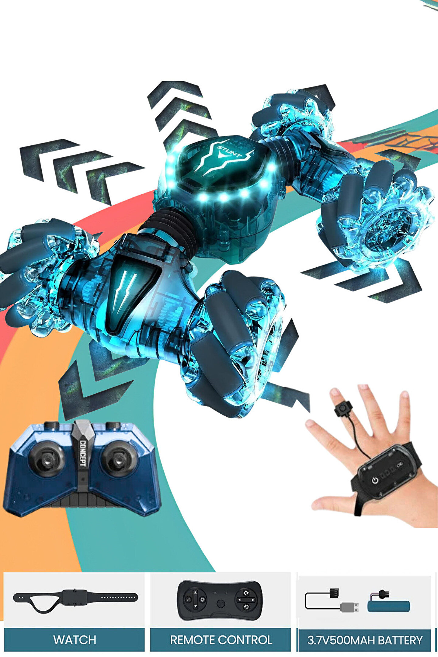 Oyuncak 2.4 GHz Bilekten ve Uzaktan Kumandalı Işıklı 4X4 Çift Kumandalı Akrobat Araba Şeffaf Model