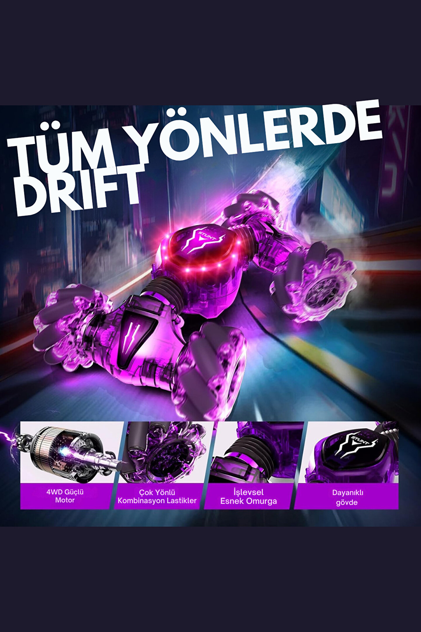 2; 4 GHz frekansında bir bilekten kumandalı ve bir uzaktan kumandalı olmak üzere 2 adet kumandaya sahiptir; Yatay gidebilen lastikleri sayesinde zorlu manevraları kolayca gerçekleştirebilir ve drift atabilir; Dikey hale gelebilen özelliği sayesinde eğlenceli ve heyecan verici sürüş deneyimi sunar; Tırmanma özelliği ile engelleri aşar; Güçlü led ışık efektleriyle donatılmıştır, hem gündüz hem de gece kullanımı için uygundur; Çocukların el; göz koordinasyonunun gelişmesine yardımcı olur; Çocuklar ve yetişkinler için eğlenceli ve dinamik bir sürüş deneyimi sunar; Kumandalar 2 adet ince(kumanda pili)pil ile çalışır; (piller dahil değildir);