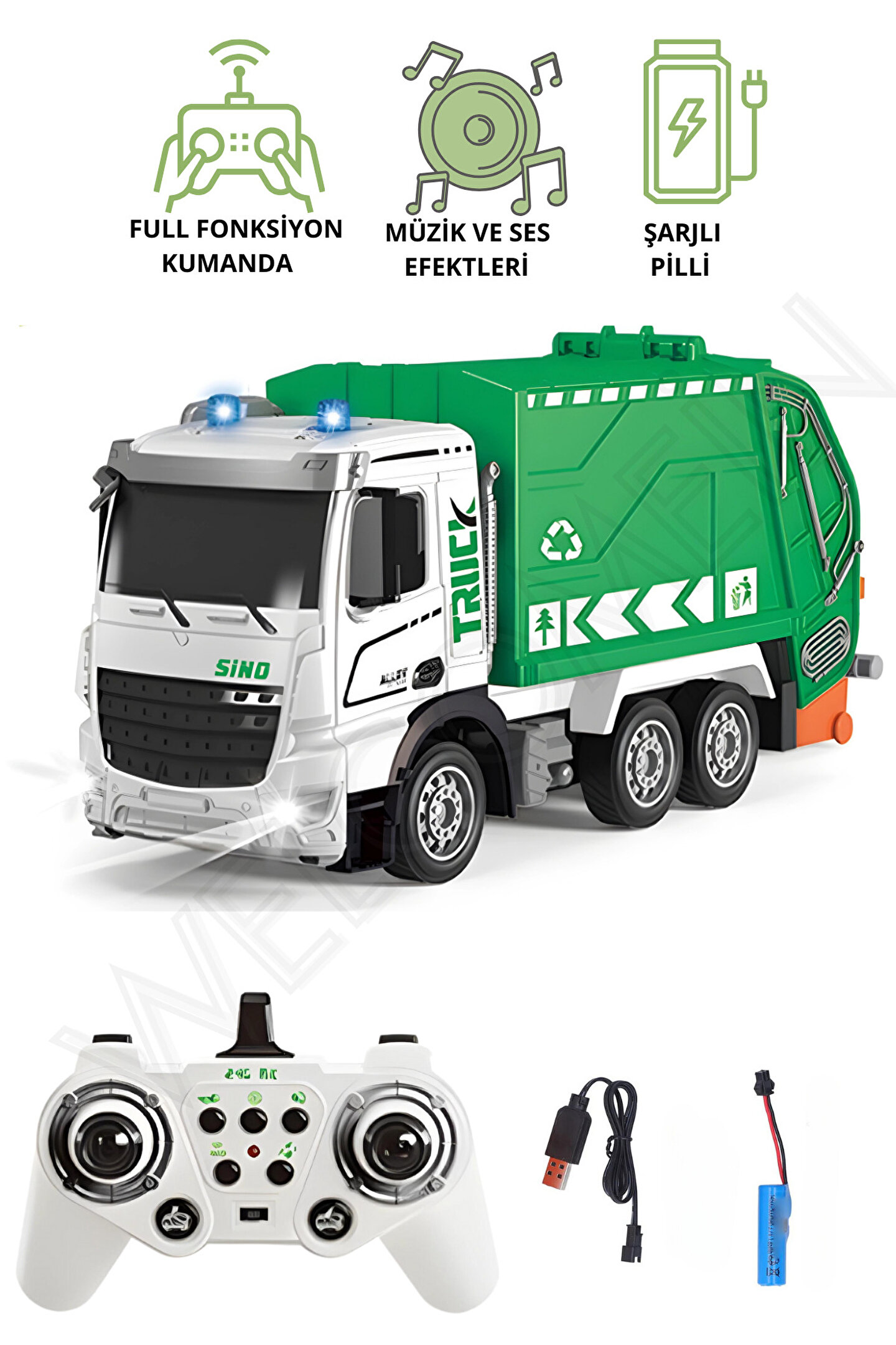 3 yaş ve üzeri çocuklar için ideal, eğlenceli ve güvenli bir oyun deneyimi sunar; 2; 4 GHz frekanslı uzaktan kumanda ile kolay kontrol imkanı sağlar, çocukların motor becerilerini geliştirmelerine yardımcı olur; 1:12 ölçek boyutuyla gerçekçi bir çöp arabası görünümüne sahiptir, minyatür detaylarıyla dikkat çeker; Işıklı ve sesli özellikleri sayesinde çocukların duyusal algısını zenginleştirir ve oyun saatlerini daha interaktif hale getirir; Şarj edilebilir bataryası ile kablosuz kullanım özgürlüğü sunar; böylece çocuklar hareket özgürlüğünü kısıtlamadan eğlenebilirler;