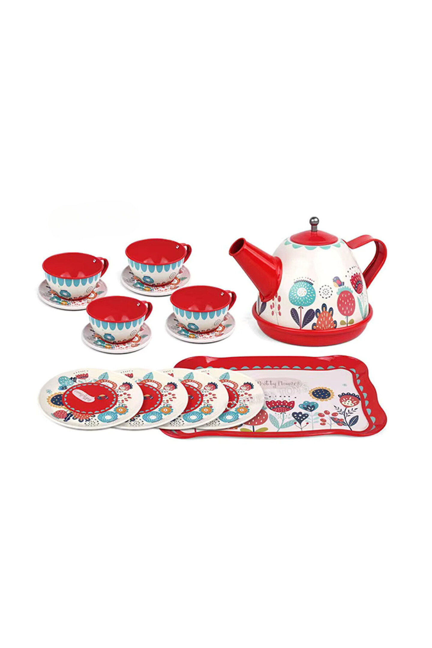 Oyuncak Evcilik Oyunu Aktivite 15 Parça Çiçekli Renkli Metal Çay Seti