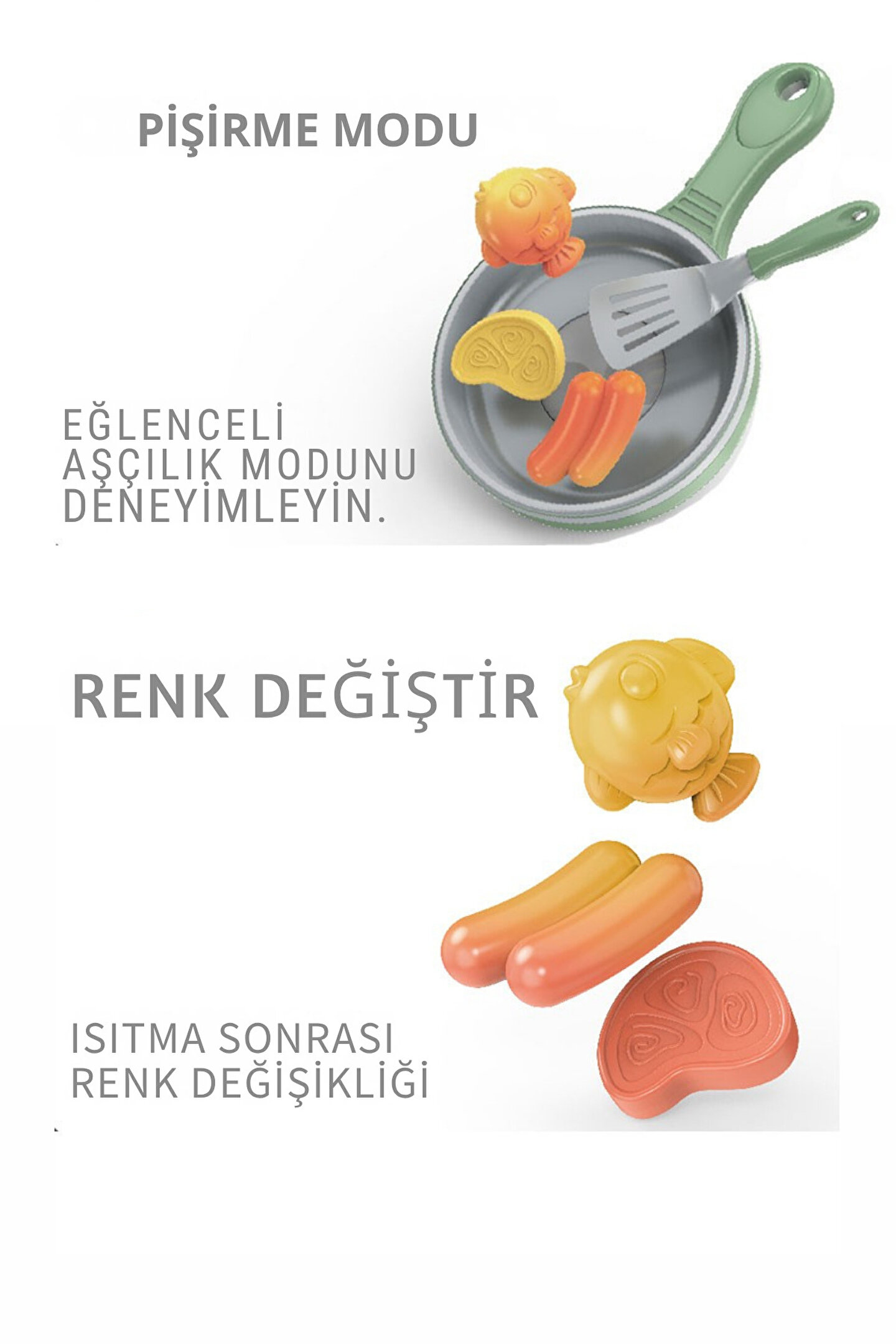 - 3 yaş ve üzeri çocuklar için ideal, eğlenceli ve eğitici bir oyuncak seti.; - Renk değiştirme özelliği sayesinde çocukların dikkatini çeker ve onlara görsel bir deneyim sunar.; - 8 parçadan oluşan set, çocukların hayal gücünü geliştirmeye yardımcı olurken, yemek yapmayı öğrenmelerine de katkıda bulunur.; - CN menşei (Çin ana karası) ile üretilen bu oyuncak, güvenle çocuklarınızın elinde olabilir.;