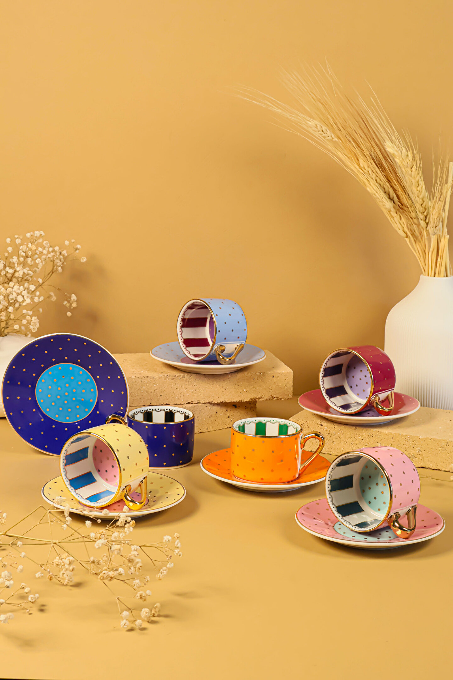 Enerjik renkler, altın ışıltısı ve modern çizgiler bir arada! Yeni koleksiyona ait bu porselen kahve fincan takımı, canlı renk paleti ve gold detaylı zarif tasarımıyla dikkat çekiyor.