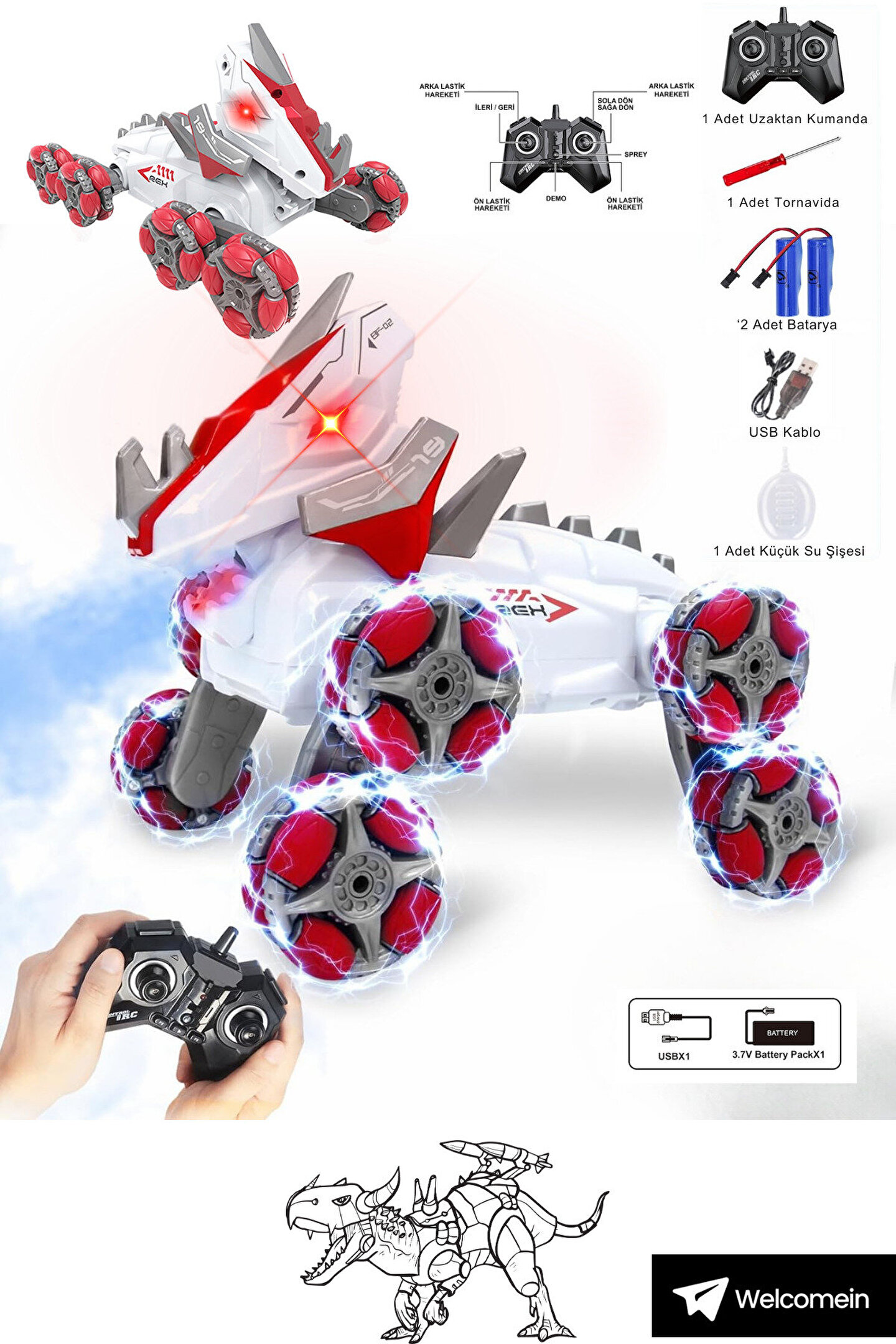 Uzaktan Kumandalı Full Fonksiyon Şarjlı 2,4G 8 Teker Buhar Atan Dinozor Kamyonet Stunt Araba +3