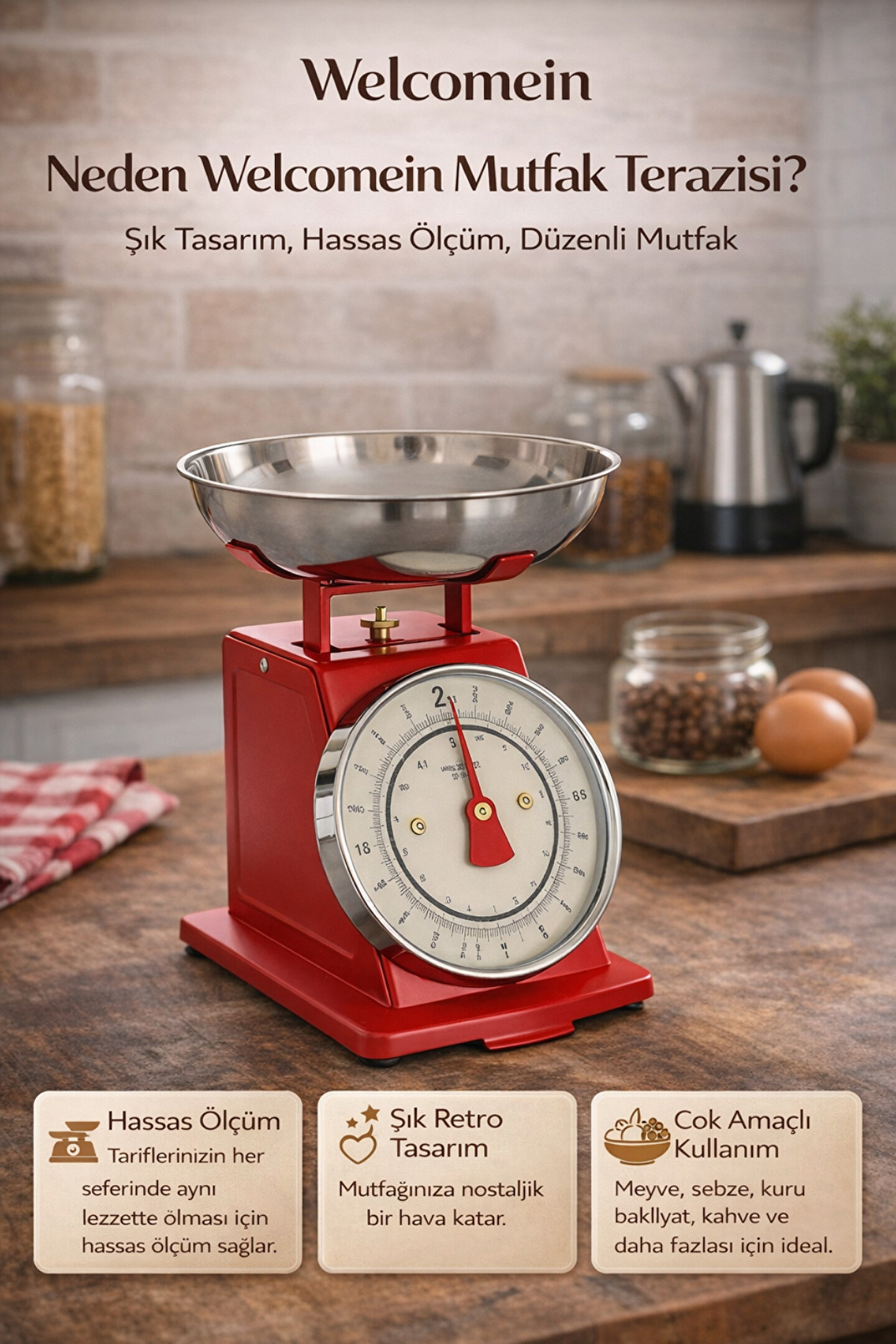 Nostaljik görünümü, sağlam yapısı ve pratik kullanımıyla bu analog mutfak terazisi, hem tariflerinizde hassas ölçüm yapmanıza yardımcı olur hem de mutfağınıza şık bir dokunuş katar.