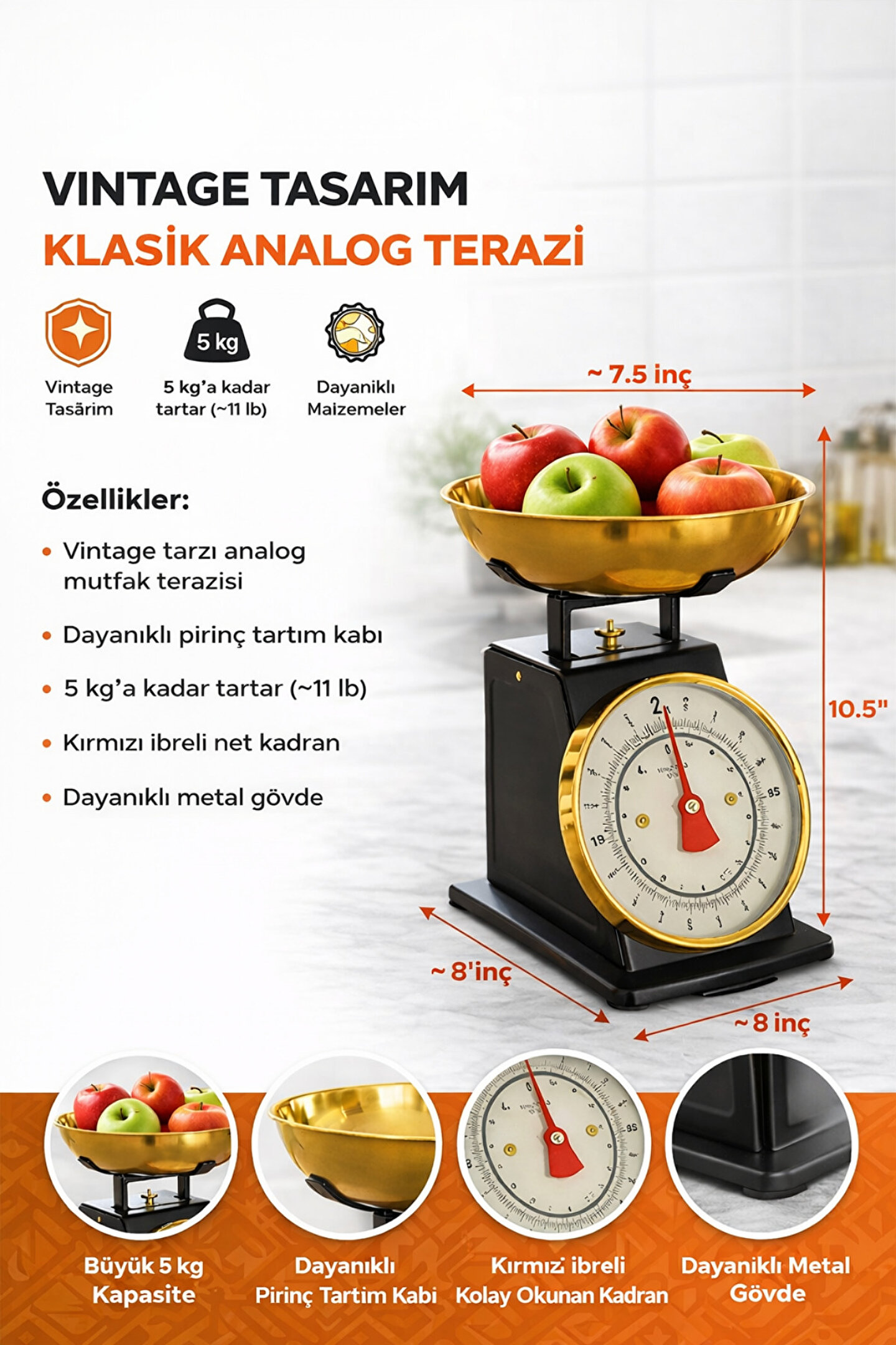Mutfakta hem şık hem de işlevsel bir yardımcı arıyorsanız, vintage tasarımlı analog mutfak terazisi tam size göre! Pirinç renkli geniş tartım kabı ve siyah metal gövdesiyle, sadece ölçüm yapmakla kalmaz, tezgâhınızda dekoratif bir parça olarak da öne çıkar.