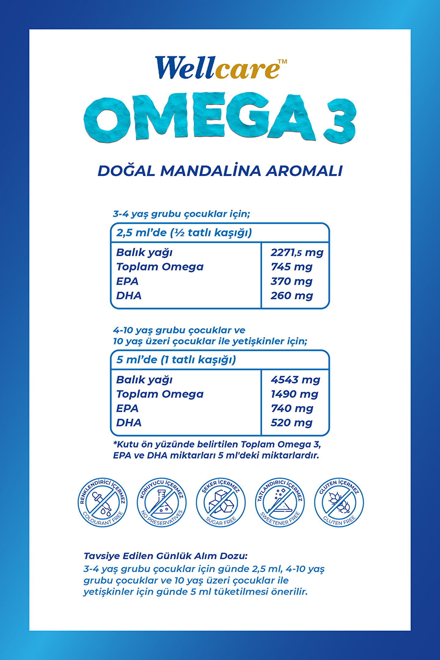 Wellcare Omega 3 Doğal Mandalina Aromalı Balık Yağı;• Trigliserid formda yüksek Omega 3 içeren Wellcare Omega 3 koruyucu, tatlandırıcı, şeker, renklendirici, gluten içermez.;• EPA ve DHA kalbin normal fonksiyonuna katkıda bulunur. Faydalı etkinin sağlanabilmesi için günde 250 mg EPA ve DHA alınmalıdır.;• DHA normal beyin fonksiyonlarının ve normal görme yetisinin korunmasına katkıda bulunur.Faydalı etkinin sağlanabilmesi için günde 250 mg DHA alınmalıdır.;• Dokosahekzaenoik asit (DHA)’in anne tarafından alınması fetusun ve emzirilen bebeklerin normal beyin ve normal göz gelişimine katkıda bulunur. Hamile ya da emziren kadınlar da faydalı etki, omega-3 yağ asitlerinin yetişkinler için önerilen günlük alım miktarlarına ek olarak ;200 mg DHA alındığında sağlanmaktadır.;Wellcare Omega 3 Ürünleri İfos Onaylıdır.;Kullanım Önerisi;3-4 yaş grubu çocuklar için günde 2,5 ml, 4-10 yaş grubu çocuklar ve yetişkinler için günde 5 ml tüketilmesi önerilir.