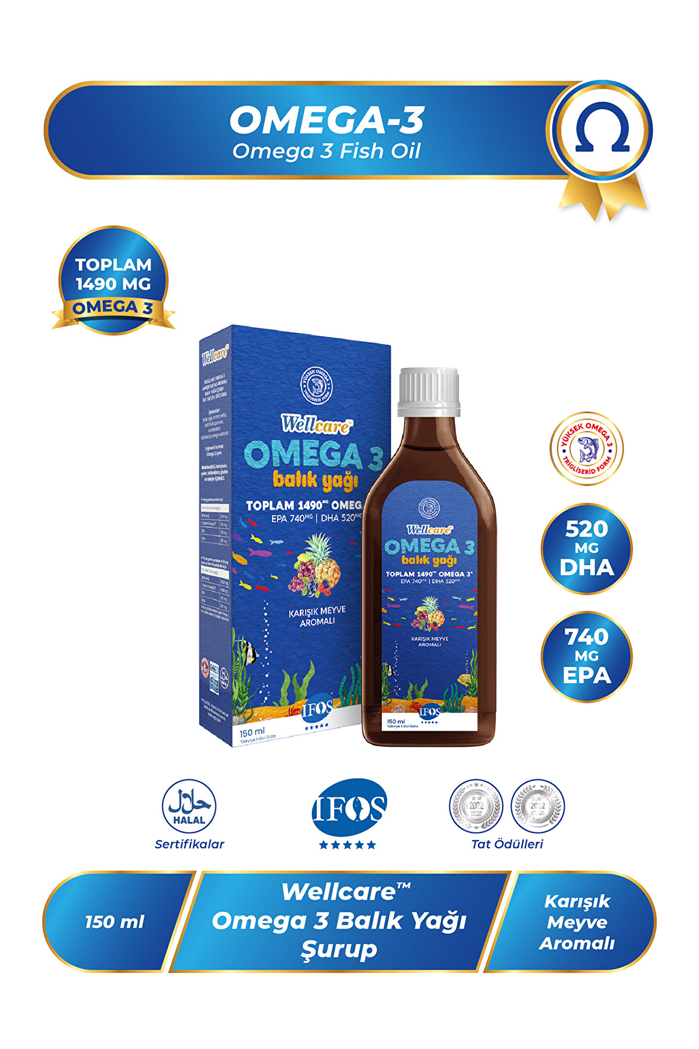 Wellcare Omega 3 Karışık Meyve Aromalı Balık Yağı;• Trigliserid formda yüksek Omega 3 içeren Wellcare Omega 3 koruyucu, tatlandırıcı, şeker, renklendirici, gluten içermez.;• EPA ve DHA kalbin normal fonksiyonuna katkıda bulunur. Faydalı etkinin sağlanabilmesi için günde 250 mg EPA ve DHA alınmalıdır.;• DHA normal beyin fonksiyonlarının ve normal görme yetisinin korunmasına katkıda bulunur.Faydalı etkinin sağlanabilmesi için günde 250 mg DHA alınmalıdır.;• Dokosahekzaenoik asit (DHA)’in anne tarafından alınması fetusun ve emzirilen bebeklerin normal beyin ve normal göz gelişimine katkıda bulunur. Hamile ya da emziren kadınlar da faydalı etki, omega-3 yağ asitlerinin yetişkinler için önerilen günlük alım miktarlarına ek olarak 200 mg DHA alındığında sağlanmaktadır.; Kullanım Önerisi;3-4 yaş grubu çocuklar için günde 2,5 ml, 4-10 yaş grubu çocuklar ve yetişkinler için günde 5 ml tüketilmesi önerilir