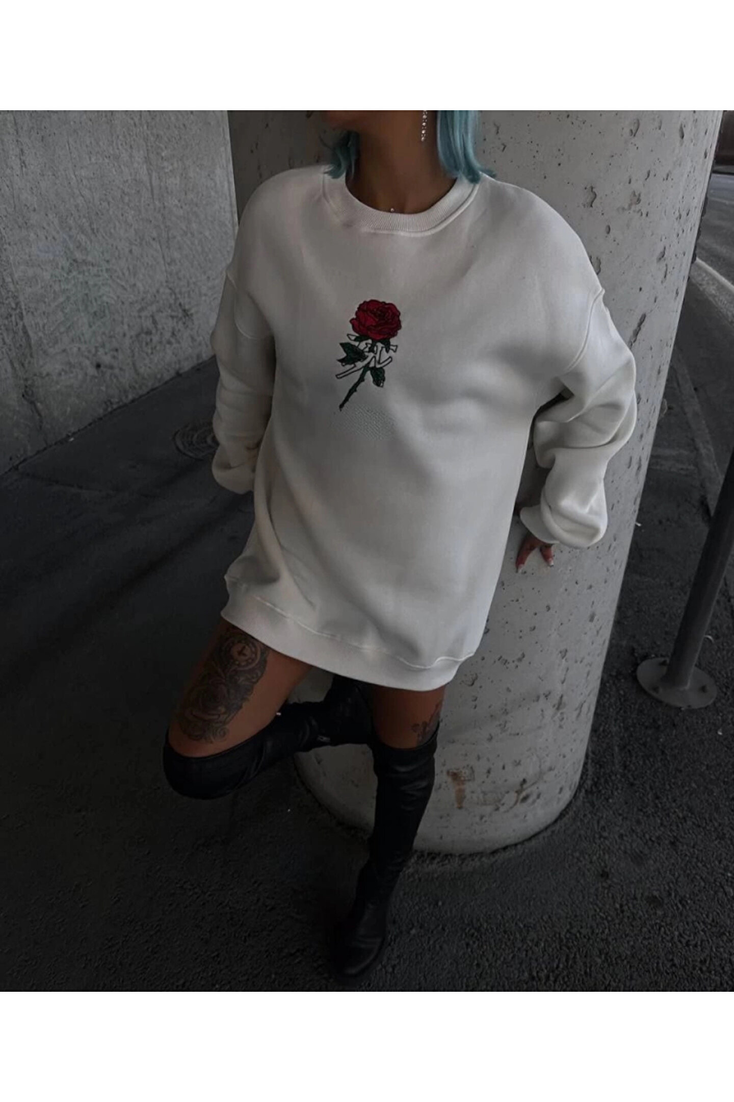Oversize Üç İplik Bisiklet Yaka Baskılı SweatShirt - Beyaz