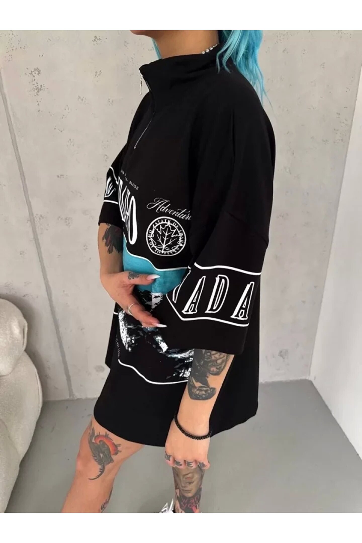 Unisex Baskılı Yarım Fermuarlı T-Shirt - Siyah Modelin Ölçüleri: Boy:165, Kg:55, Göğüs:90, Bel:72, Kalça: 100 Modelin üzerindeki ürün M/38 bedendir