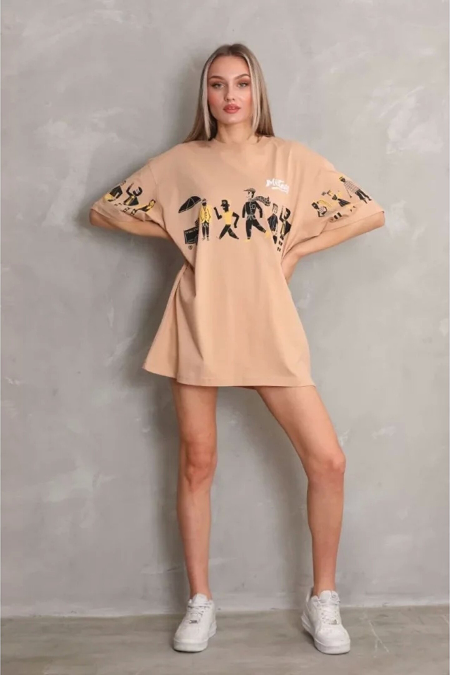 Unisex Bisiklet Yaka Baskılı Oversize T-Shirt - Bej Modelin Ölçüleri: Boy:165, Kg:55, Göğüs:90, Bel:72, Kalça: 100 Modelin üzerindeki ürün M/38 bedendir