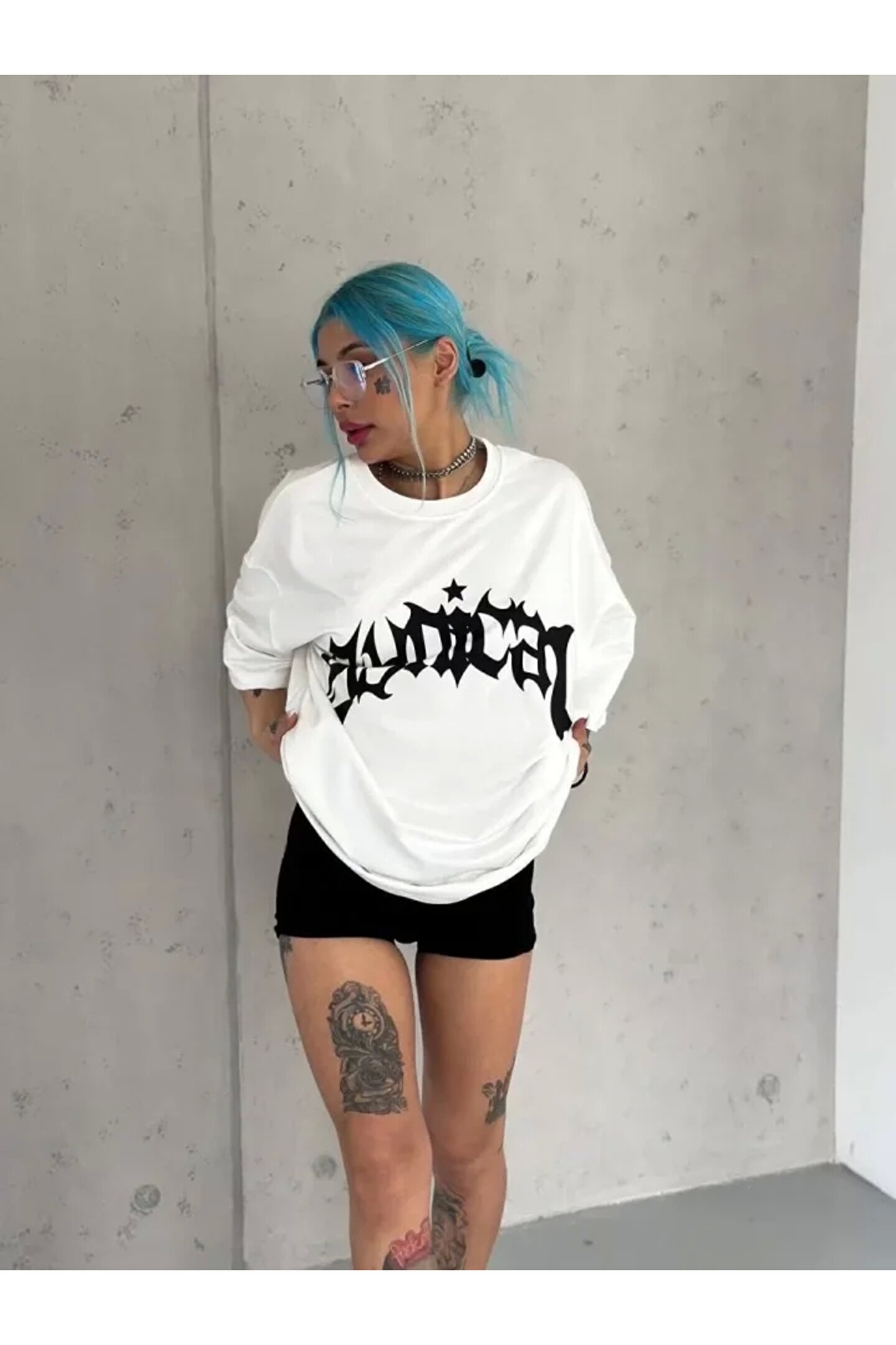 Unisex Bisiklet Yaka Baskılı Oversize T-Shirt - Beyaz Modelin Ölçüleri: Boy:165, Kg:55, Göğüs:90, Bel:72, Kalça: 100 Modelin üzerindeki ürün M/38 bedendir