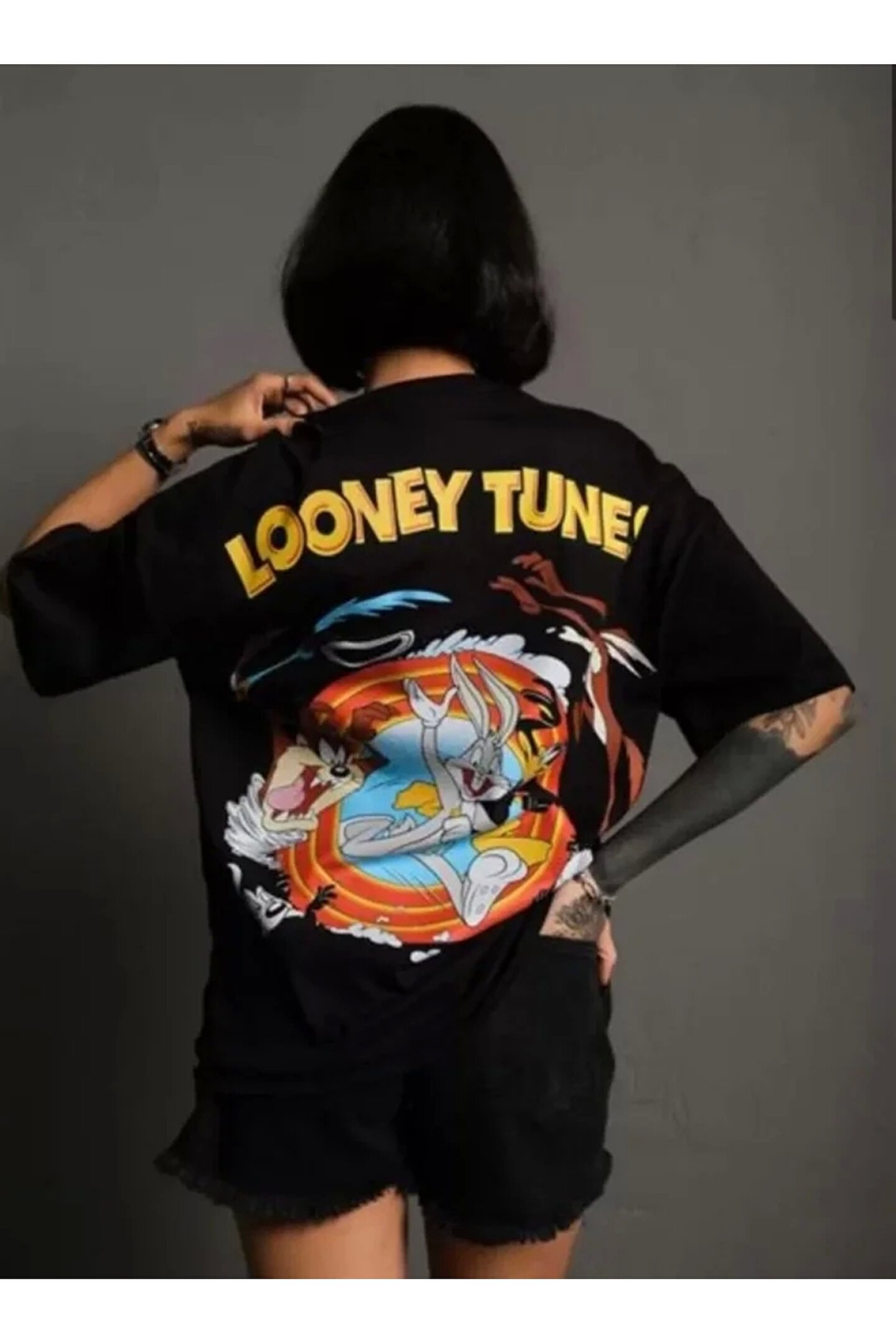 Unisex Bisiklet Yaka Baskılı Oversize T-Shirt - Siyah Modelin Ölçüleri: Boy:165, Kg:55, Göğüs:90, Bel:72, Kalça: 100 Modelin üzerindeki ürün M/38 bedendir