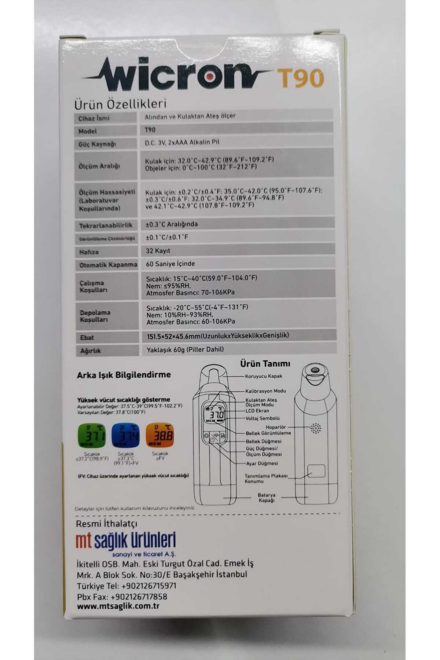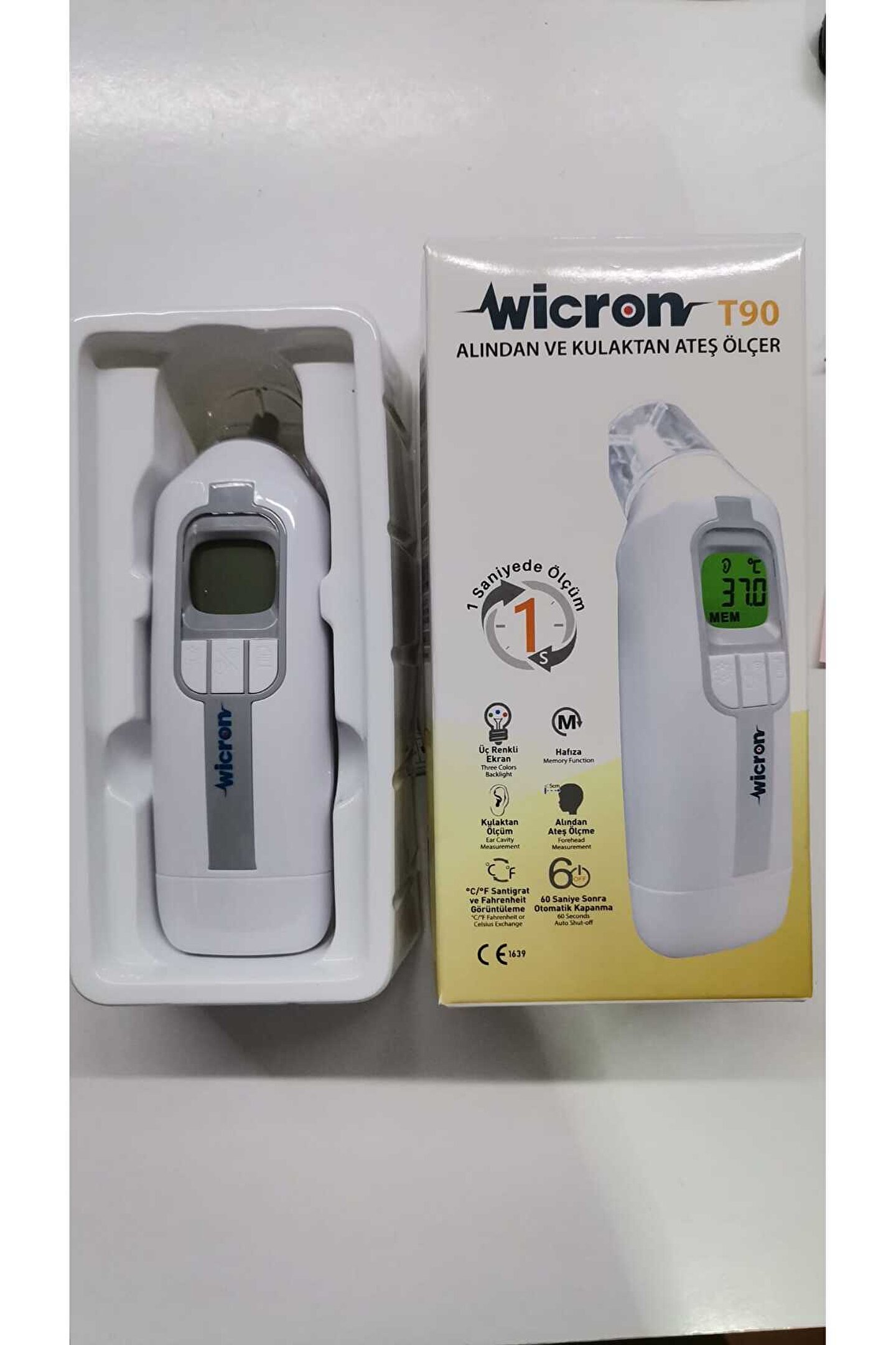 1-Wicron alından ve kulaktan ateş ölçer termometre 2-3 renkli ekran 3-32 ölçüm belleği 4-Kulaktan ve alından ölçüm(25 adet kulaktan ölçme aparatı) 5-60 sn.; Otomatik kapanma
