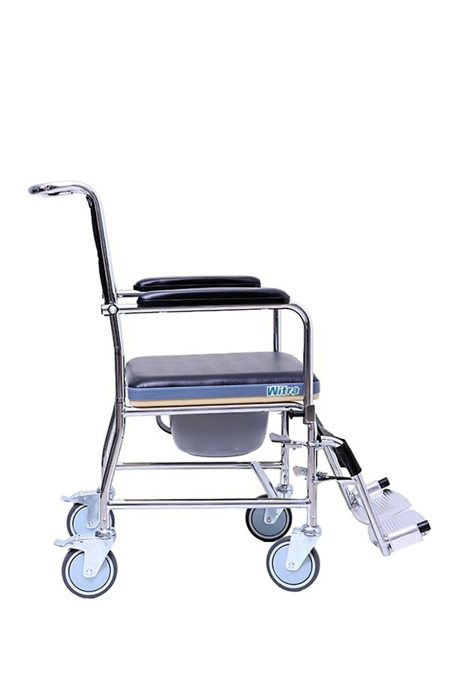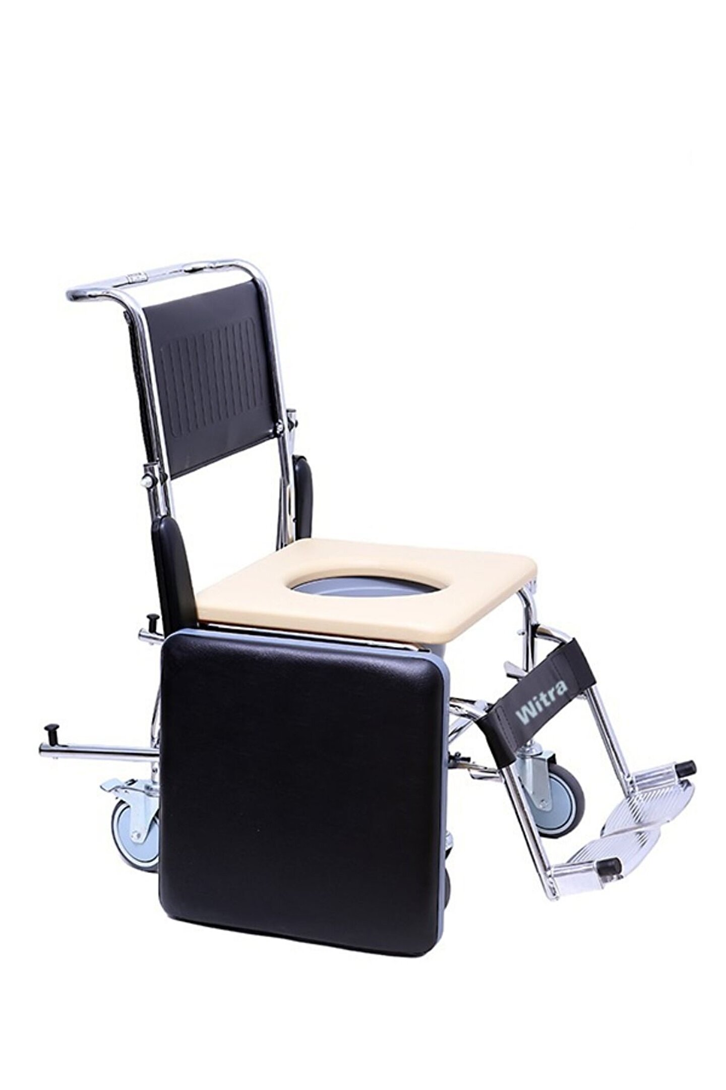 Banyo ve Tuvalet Sandalyesi Genel Özellikleri Witra lazımlıklı tekerlekli sandalye, çıkartılabilen ayaklıklara sahip olması sayesinde kullanıcı istediği takdirde ayaklıkları kolaylıkla çıkartıp takabilmekle beraber çıkarıldığında ekstradan depolamak için yer tasarrufu sağlar. Oturma yeri yüksekliği sayesinde, altındaki lazımlık çıkartılarak standart klozetlere yanaşma imkânı da sunan Witra banyo tuvalet sandalyesi, tekerleklerinin kilitlenmesine ve sandalyeyi sabitlemeye imkan vermektedir. mindere sahip olan Witra engelli tuvalet sandalyesi beraber oluşabilecek mantar, bakteri, istenmeyen koku problemlerini ortadan kaldırır. Paslanmaz şase ile suya karşı dayanıklı bir klozetli tekerlekli sandalye modeli olan Witranın lazımlık kısmı çok basit bir sürgülü sistemden oluşmaktadır ve kullanıcı veya refakatçi hiçbir zorluk çekmeden lazımlığı dilediği gibi takıp çıkarabilmektedir. Katlanabilir şase ; Çıkartılabilen ayaklıklar ; Hareketli kolçaklar ; Frenli sistem tekerlekler ; ve su geçirmez oturma minderi ; Paslanmaz şase ; Refakatçi kolları ;
