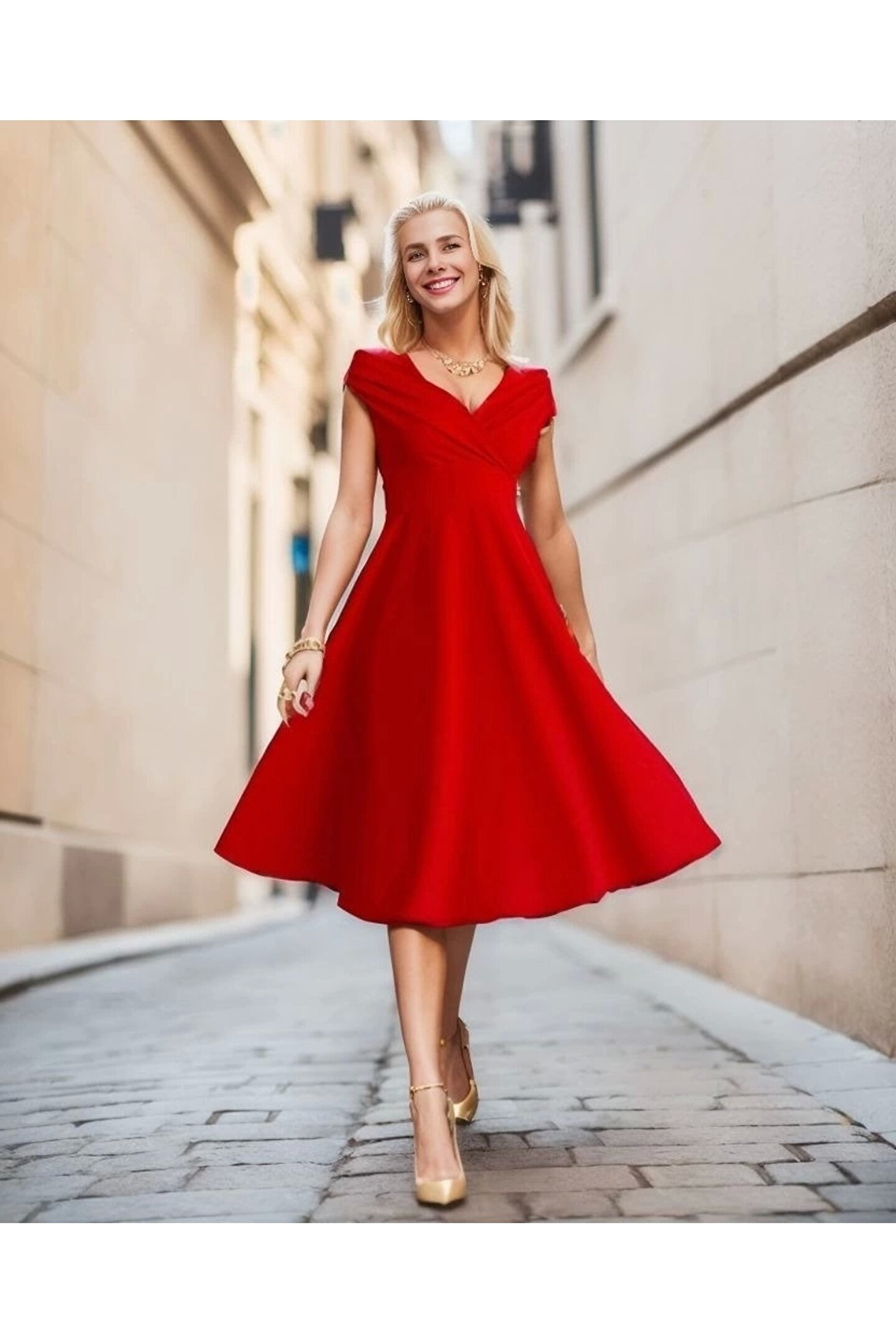 Wooho Kadın Kısa Kollu Kruvaze Yaka Eteği Volanlı Krep Elbise
