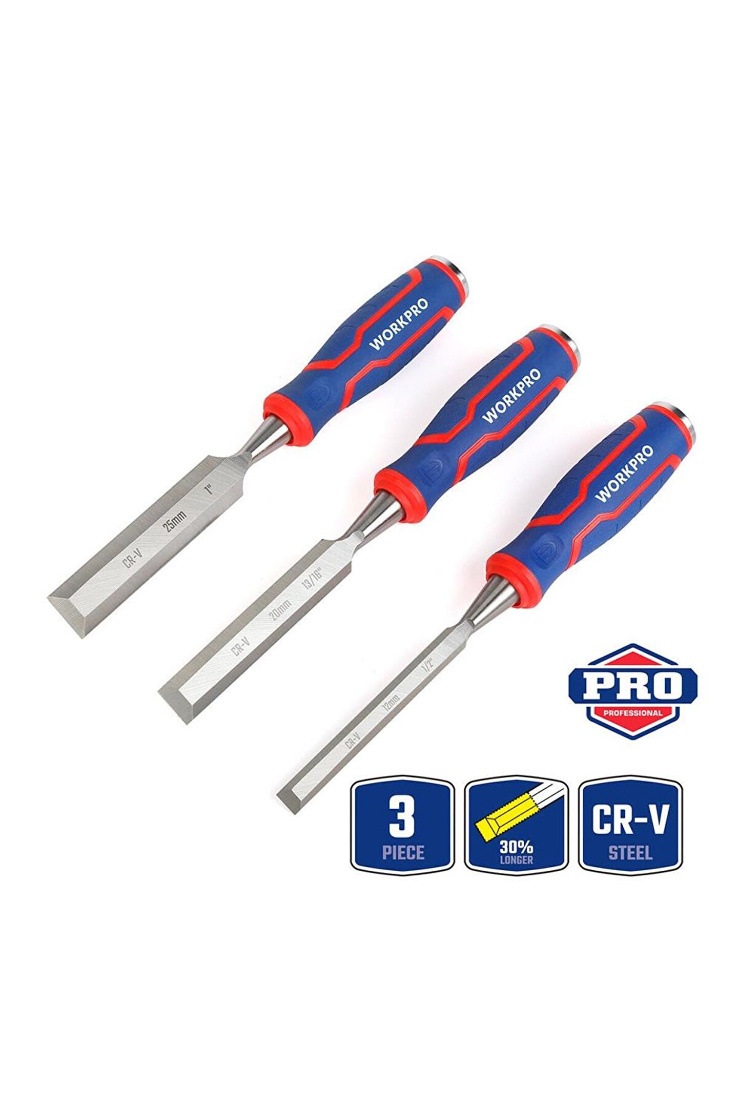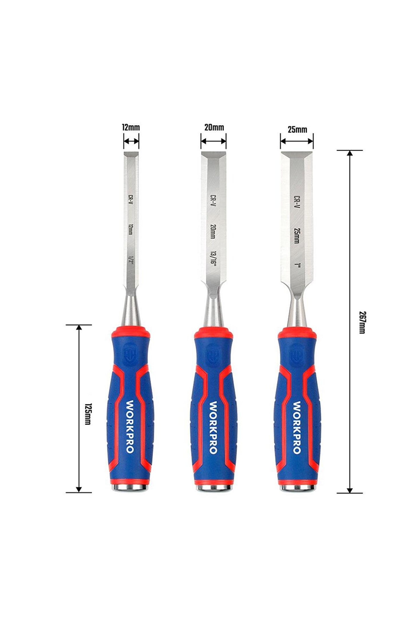 • WORKPRO WP201301 12-20-25MM Üçlü Profesyonel İskarpela Seti • Marangoz hanelerde, hobi ve oyuncak atölyelerinde kapı, pencere, masa, sandalye, çerçeve, maket gibi hobi veya profesyonel tüm oyma ve şekil verme gibi işlerde paslanmaya ve aşınmaya karşı dayanıklı ve uzun ömürlü kullanım için krom Vanadium dövme çelikten üretilmiştir.; • Sertleştirilmiş dövme CR-V çelikten üretilmiş son derece keskin ağız yapısı sayesinde keskinliğini çok uzun süre korur, yorulmadan daha hızlı oyma ve şekil verme işlemi yapmanızı sağlar.; • Yüksek kaliteli CR-V çelik kullanılmıştır, hassas ve ısıl işlemden sonra kesici uç daha sert ve dayanıklı hale getirilmiştir.; • Cr-V alaşım, pas ve korozyon gibi dış etkenlerden koruyarak uzun ömürlü yapı kazandırır.; • Uzun boy Çelik CR-V şaft sayesinde dar ve derin yerlere kolay erişim imkânı.; • Çekiç veya tokmak ile sert ve sürekli darbelere dayanıklı hale getirilmiş çelik dipçik sayesinde profesyonel kullanım imkânı.; • Patentli ANTI-SHOCK™ Avuç içini terletmeyen ve titreşim emici kauçuk kaplı tutma sapı sayesinde uzun süreli çalışmalarda avuç içine zarar vermez el ve bilek sağlığınızı korumanızı sağlar.; • PVC duvar askı delikli, kilitli koruyucu muhafaza kılıfı sayesinde güvenle taşımanızı ve saklamanızı sağlar.; • WORKPRO, Amerika Birleşik Devletleri menşeli profesyonel bir El Aleti markası olup 1992 yılında kurulmuştur.; • WORKPRO, Dünyanın en büyük El Aleti üreticisidir ve Mekanik El Aletleri alanında dünya çapında 21 üretim üssüne sahiptir.; • WORKPRO, Dünya genelinde 5 AR-GE üssü ve inovasyon teknoloji merkezleri sayesinde, her yıl 400'den fazla yeni ürün geliştirmektedir.; Sektöründe 700'den fazla uluslararası patentin de sahibidir.; • WORKPRO, Sadece profesyonel değil, aynı zamanda Rekabetçi Fiyat, Yüksek Kalite ve Geniş Ürün Çeşidiyle Dünya çapında 100’den fazla ülkede hizmet vermektedir.