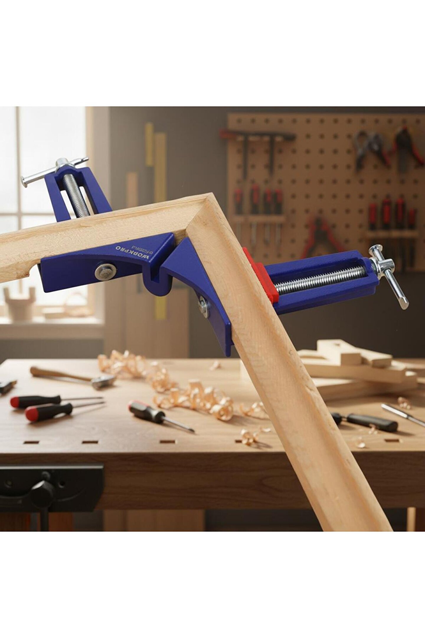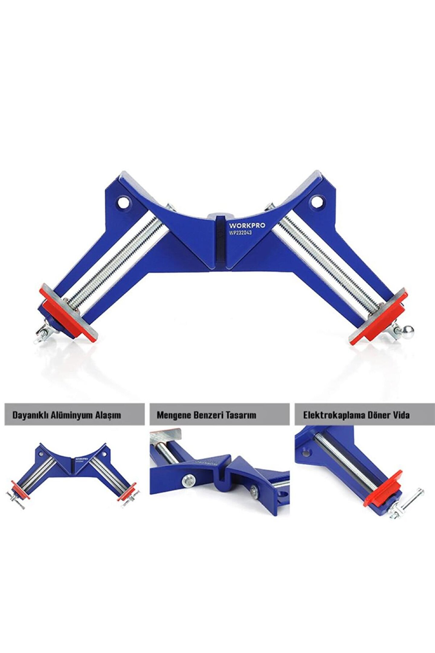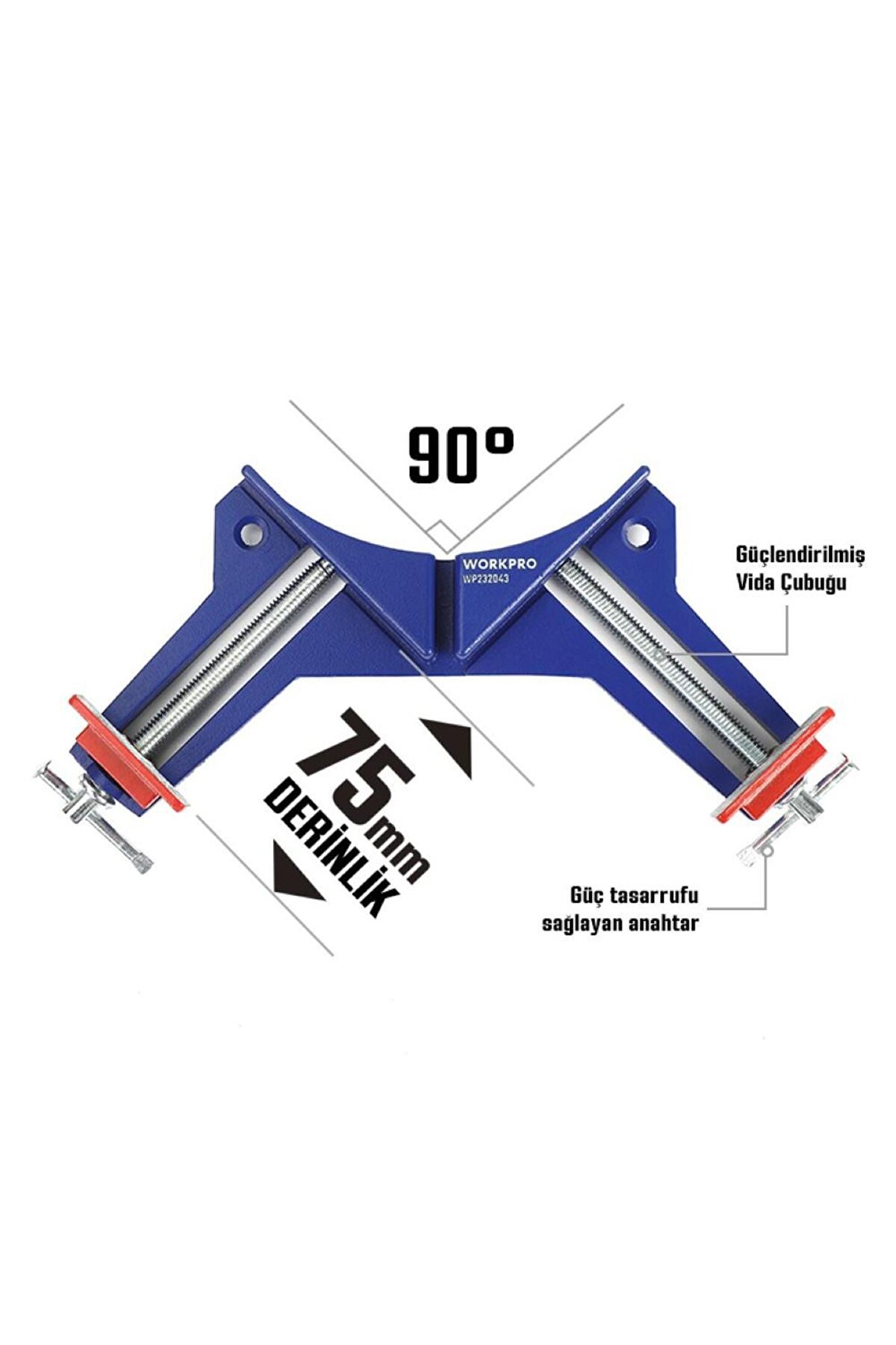• WORKPRO WP232043 75mm 90° Profesyonel Köşe İşkence • Marangoz hanelerde, demir doğrama atölyelerinde vb.; üretim alanlarında metal, ahşap veya plastik parçaların geçici sabitleme ve birleştirme işlemlerinde, her türlü farklı parçaların birleşim noktalarından yapıştırıcı tutkal veya kaynak ile sabitlenmesinde, işkence vazifesi görebilmesi için gövde paslanmaya karşı güçlendirilmiş alüminyum gövde ve çeneleri sayesinde uzun ömürlü ve profesyonel kullanım imkânı sunar.; • Ahşap, Metal, PVC vb.; 75mm kadar iki ayrı parçaların 90° lik açı ile köşelerinin güvenli biçimde birleştirilerek sabitlenmesi için tasarlanmıştır.; • Yüksek kaliteli alüminyum alaşımlardan üretilen köşe işkence yüksek sıkıştırma gücü ve darbelere karşı sağlamlık sunar.; • 75mm kadar ayarlanabilir çene genişliği sayesinde birçok köşe montaj işlemlerinde farklı kalınlıktaki malzemelere tam uyum sağlar.; • Boyutlar: 230mm x 100mm x 80mm.