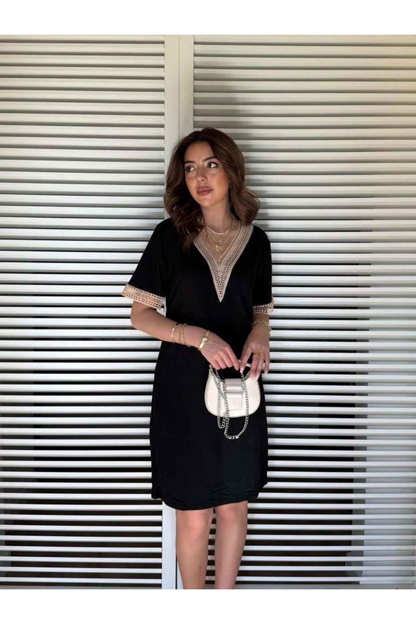 Kadın V Yaka Güpürlü İki İplik Elbise