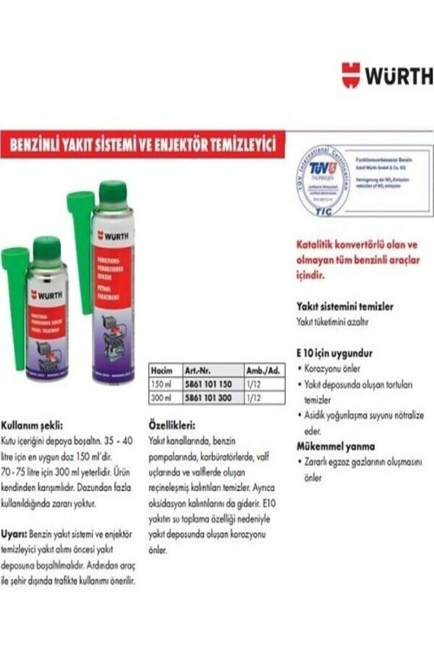 Würt Benzin Enjektör Temizleyici ve Benzin Katkısı SKT:2026 Kutu içeriğini yakıt tankına boşaltın; 35; 40 litre için optimum miktar 150 ml'dir; 70; 75 litre için 300 ml yeterlidir; Ürün kendi kendine karışır; Çok fazla ürün karıştırılması hiçbir zarar vermez; ;;
