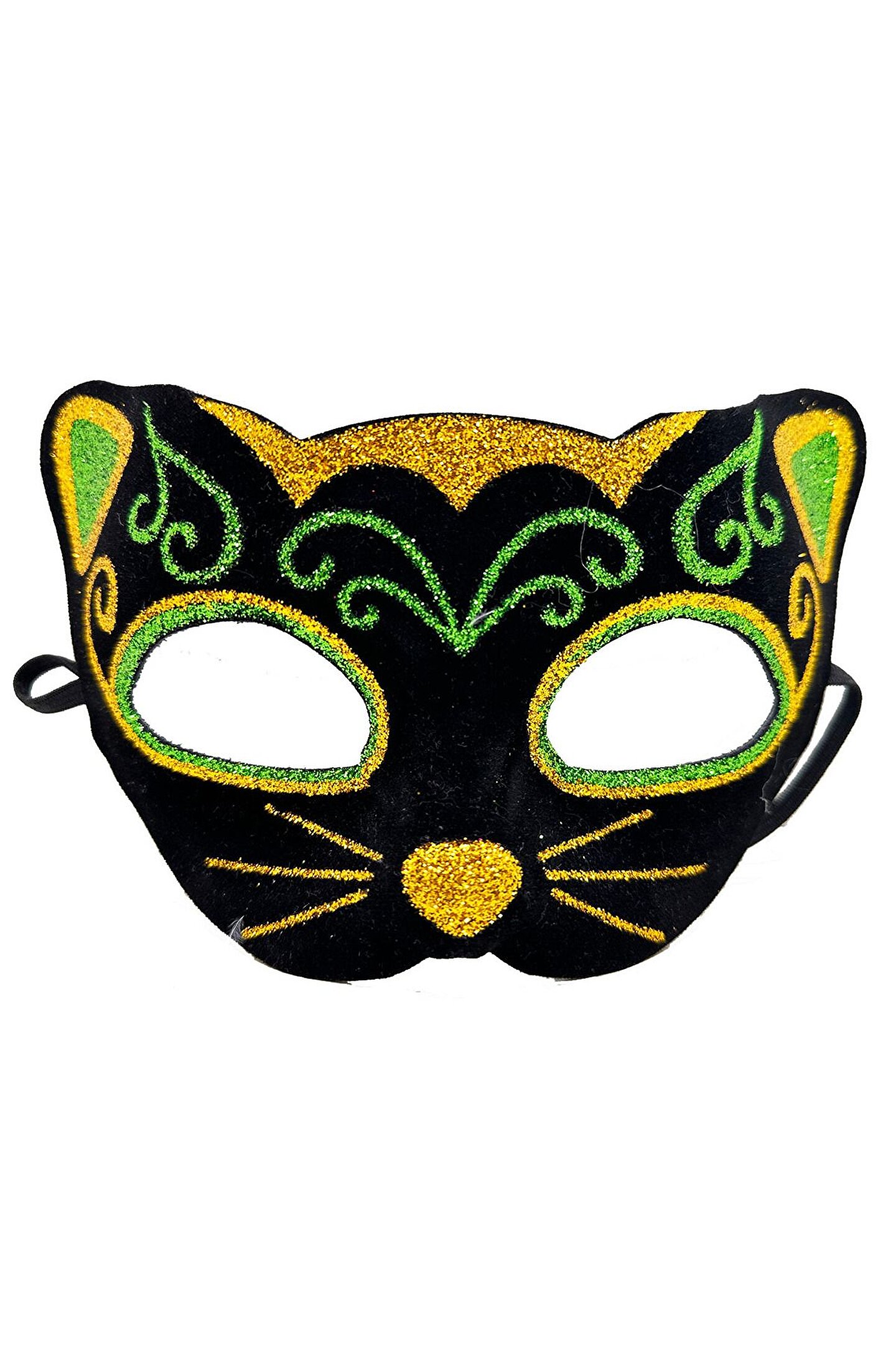 Samur Parti Parti Aksesuar & Kostüm Siyah Kadife Kaplama Üzeri Sarı Yeşil Sim Işlemeli Kedi Maskesi