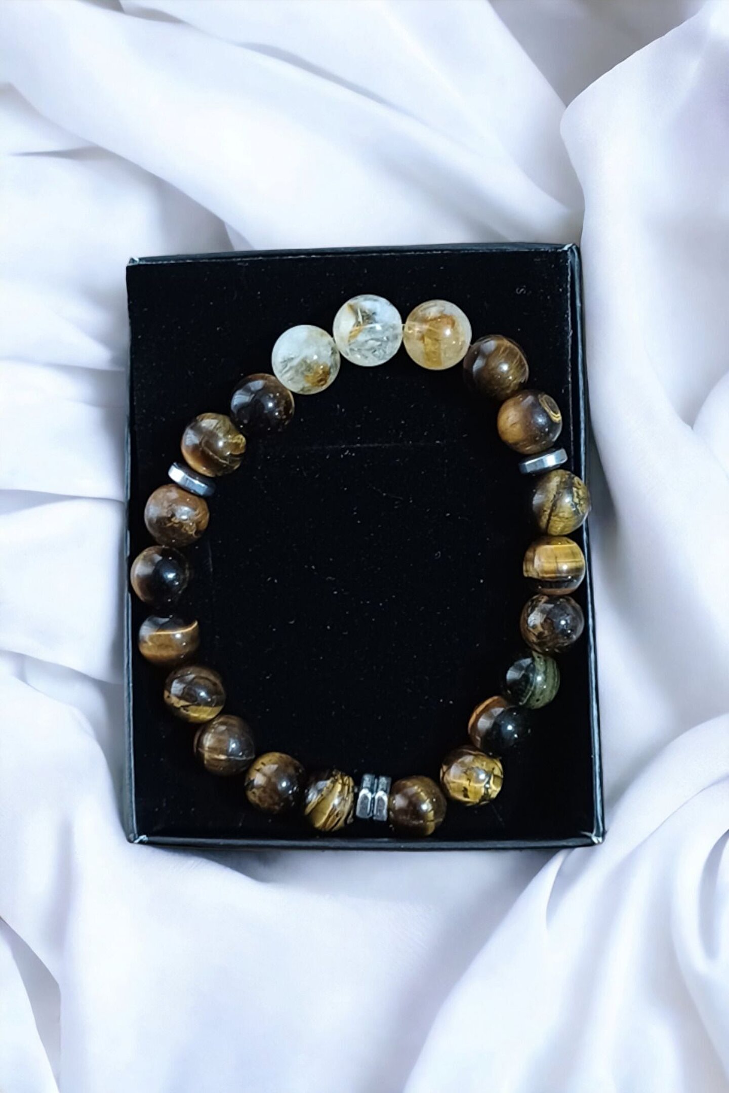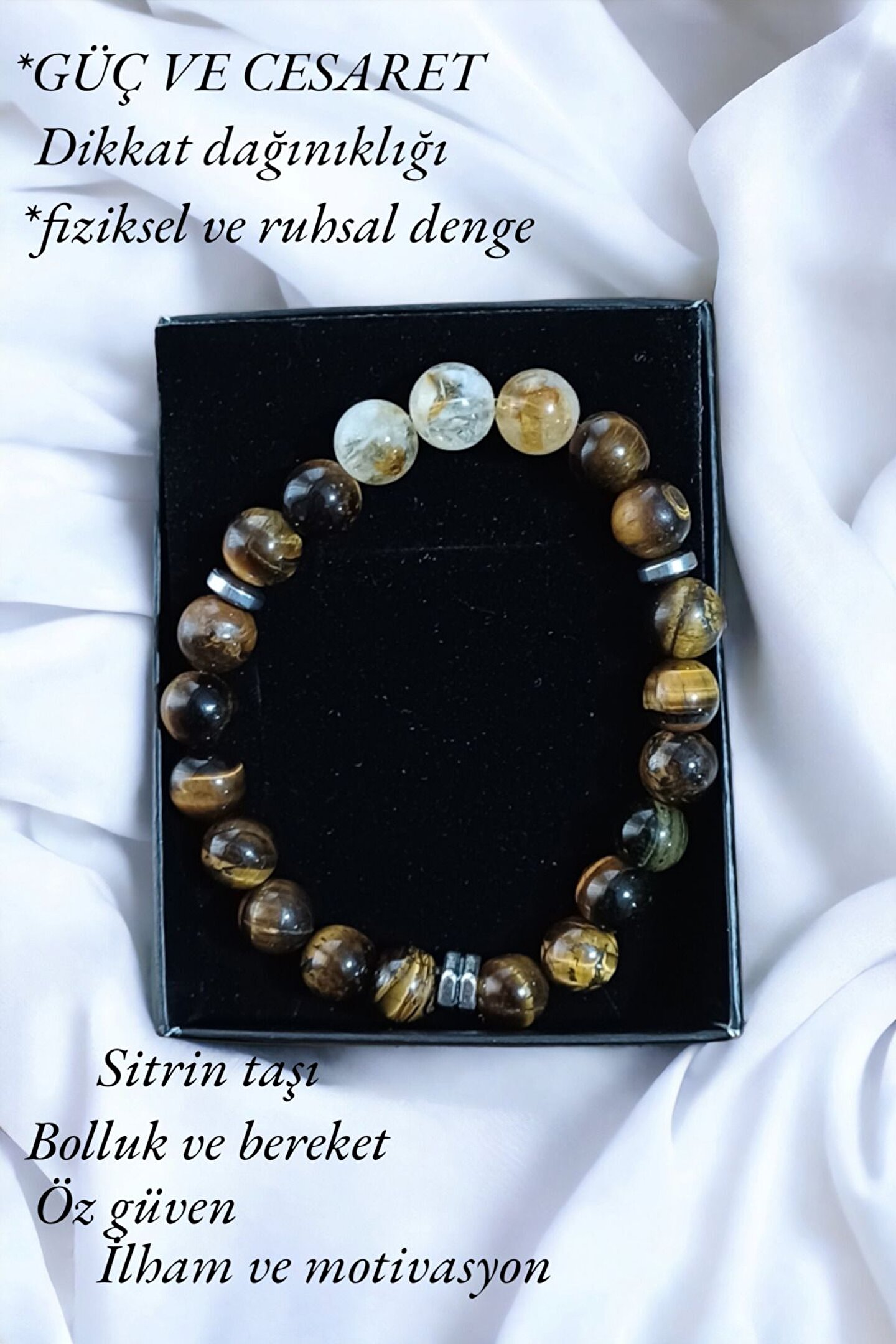 Doğal taş kullanımı ile öne çıkan bu bileklik, gençlerin enerjisini yansıtan stil sahibi tasarımıyla dikkat çeker.; Kaplan gözü ve sitrin taşının benzersiz kombinasyonu, bileğe şık ve modern bir görünüm kazandırır.; Taşların doğal yapısı, her biri eşsiz olan parçaların elde edilmesi nedeniyle her bilekliğe farklı bir karakter kazandırır.; Gençlerin tarzını tamamlayan bu bileklik, günlük kullanımda rahatlıkla tercih edilebilir ve her türlü kıyafetle uyum sağlar.;