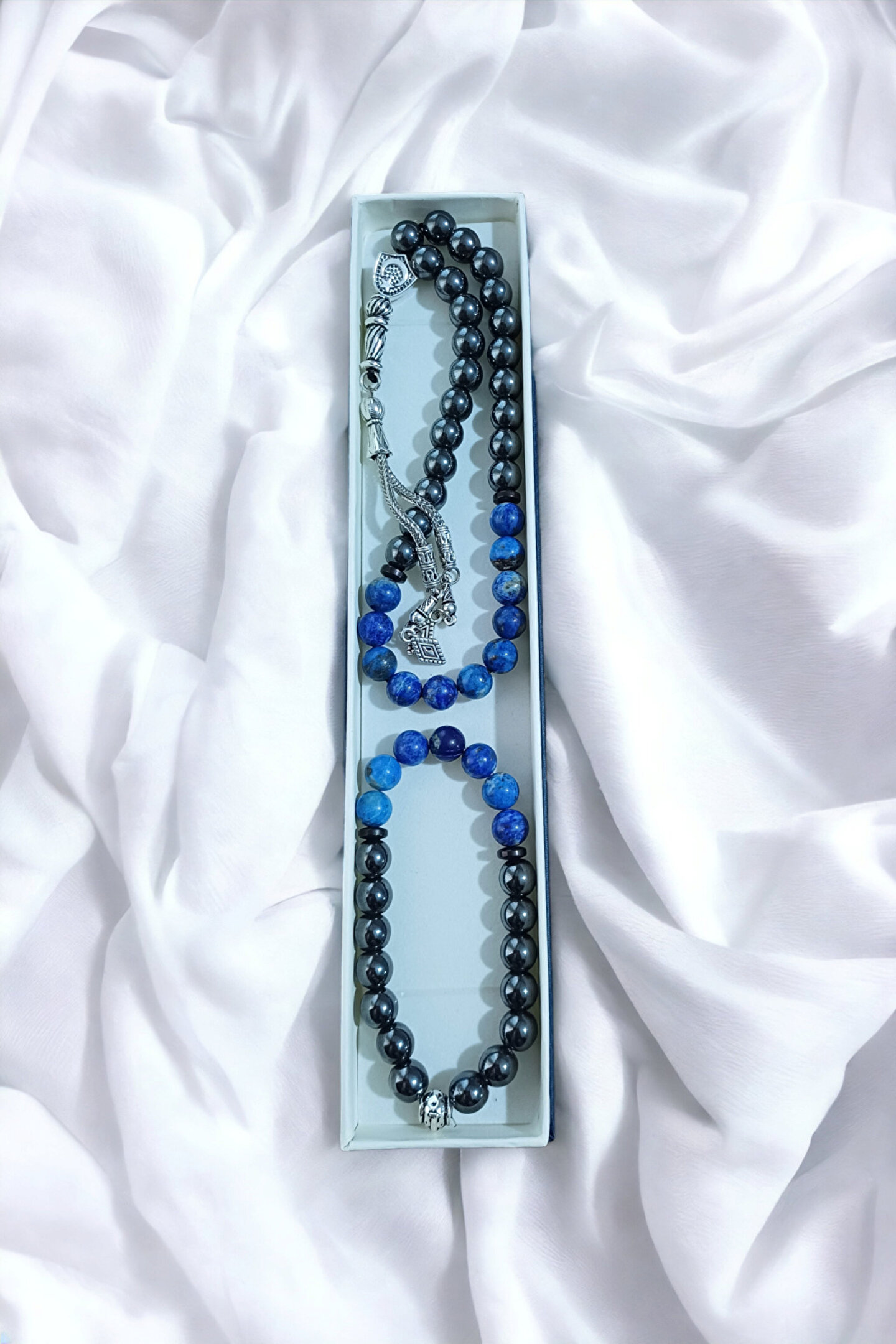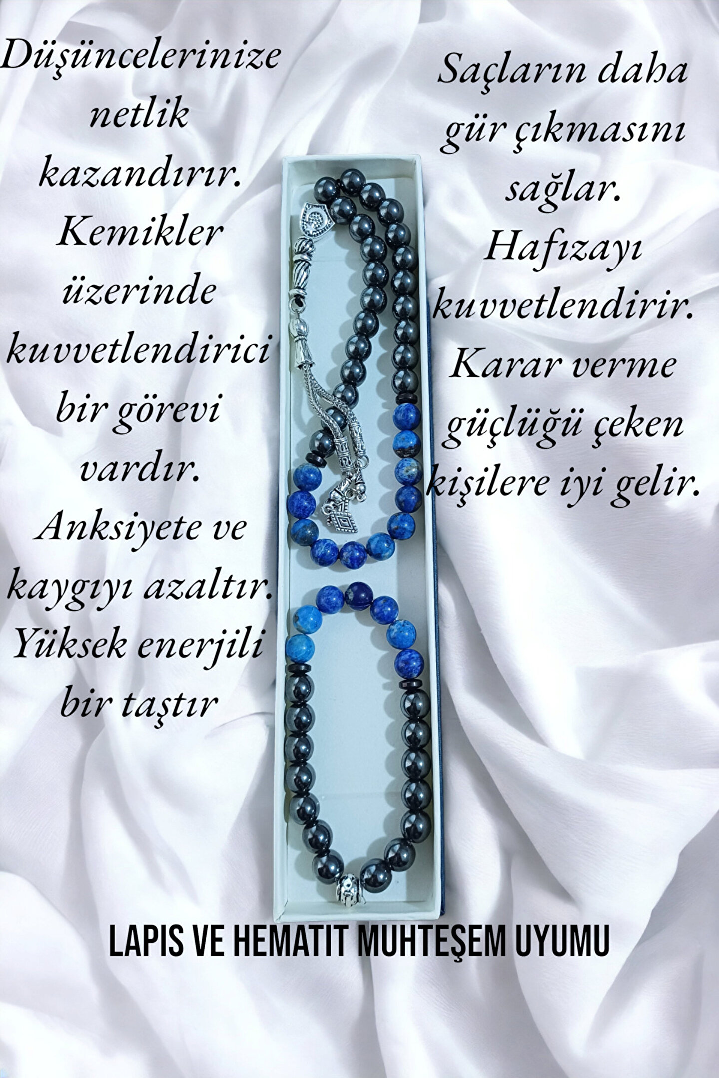 Gençlerin enerjisine ve stiline uyum sağlayan, doğal taşlardan oluşan bu bileklik, günlük kullanım için idealdir; Lapis ve hematit gibi değerli taşların eşsiz dokunuşuyla tasarlanmış, her kıyafetle kolayca kombinlenebilen bir aksesuar; Doğal taş materyali sayesinde her bileklik benzersizdir ve her kullanımda farklı bir görünüm sunar;