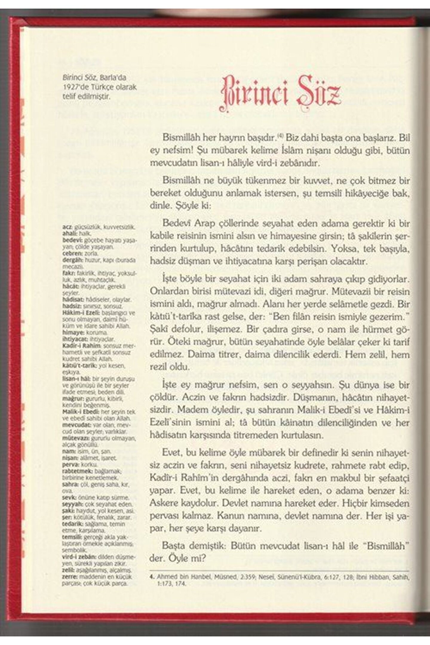 Risalei Nur Külliyatı En Çok Okunan 3 Kitap Sözler, Lemalar, Mektubat Set Yeni Tanzim-Büyük Boy-Sayfa içi lügatçeli-indexli-Ivory kağıt- Bediüzzaman Said Nursi / Yeni Asya Neşriyat Basım Yılı: 2020; Baskı: 1; Sayfa Sayısı: 2528; Kağıt Türü: Şamuha Kağıt; Ebat: 17 x 24; Dil: Arapça, Türkçe; Dil: Arapça, Türkçe; Cilt Durumu: Ciltli; Renk: Renkli; Yazar: Bediüzzaman Said Nursi; Risalei Nur Külliyatı En Çok Okunan 3 Kitap Sözler, Lemalar, Mektubat Set Yeni Tanzim-Büyük Boy-Sayfa içi lügatçeli-indexli-Ivory kağıt- Özellikler 1- Derkenar sözlük: Her sayfanın yan tarafında, cümlenin içinde geçen kelimelerin anlamları.; 2- Ayet-Hadis mealleri ve kaynakları: Geçtiği sayfanın altına konulmuştur.; 3- Arapça ve farsça metinlerin tercümeleri.; 4- Telif Tarihi: eserin yazıldığı tarih.; 5- İndeks.; Yapılan yenilikleri şu şekilde sıralayabiliriz: 1. Sayfa kenarlarında yer alan lügatçe kısmında, metinde gecen ve günlük dilde çok kullanılmaması sebebiyle ekseriyetçe bilinmediğini düşündüğümüz bazı kelimelerin manaları verilmiştir.; Bu yapılırken, kelimeye, geçtiği sayfadaki mananın verilmesine itina gösterilmiştir.; Ayrıca, bilinen lügat manasının dışında, Risale-i Nur'un orijinal üslûbu içinde kendisine has bir manada kullanılan kelime veya kelime gruplarının açıklaması da, buna uygun şekilde yapılmaya çalışılmıştır.; 2. Takdir edersiniz ki Risale-i Nur gibi, Osmanlıca kelimelerin, Arapça ve Farsça terkiplerin yoğun bir şekilde yer aldığı özel bir Kur'ân tefsirinin imlâsının Latin harfleriyle tam olarak karşılanması mümkün değildir.; Bununla beraber Risale-i Nur'un eşsiz bir dil ve üslupla Kur'ân'ın mu'cizeliğini isbat eden manevî bir tefsir olması ve sahip olduğu bu hususî lisan ile okurlarını Kur'ân'ın kudsî atmosferine dahil etmesi gibi özelliklerini dikkate alarak, rûh-u aslîyi rencide etmemek adına, eserdeki kelimeleri büyük ölçüde aslına uygun bir imla ile yazmaya gayret ettik.; Bunu yaparken de, esas olanın mana olduğunu düşünerek ve Harf İnkılâbı ile birlikte dilimiz üzerinde yaşanan menfî durumu ârizî ve geçici bir hâl kabul ederek, vasat bir yolu tutmayı ihtiyar ettik.; Büyük ölçüde kelimeleri aslına uygun yazmaya gayret etmekle birlikte, genelin ünsiyet ettiği bazı kelime yazılışlarını da, lafzı değil manayı esas almak suretiyle, günlük dilde kullanıldığı gibi bırakmayı tercih ettik.; Bu vesileyle, Risale-i Nur imlasının tam olarak yansıdığı, belki de Kuran harfli metin ile Latin harfli olanın karşılıklı sayfalarda yer aldığı bir Külliyat çalışmasını da, âlem-i İslâm'ın ortak yazısı olan Kur'an harflerini öğrenmeye yeni nesilleri teşvik edeceği düşüncesiyle, yayınevi olarak hederlerimiz arasına aldığımızı ifade etmiş olalım.; Bir ihtisas heyeti tarafından istişarelerle yürütülen bütün bu çalışmalarda bize, Risale-i Nur'da yer alan "Türk lisanının sadmeler [darbeler] geçirmesine bakılırsa, Risale-i Nur, Türkçe'de, lisan üzerinde de imam olacağı" (Emirdağ Lahikası, 59. Mektub) ifadesi ışık tutmuştur.; 3. Kitabın girişindeki "Bediüzzaman Said Nursî kimdir?" kısmında, Risale-i Nur Enstitüsü tarafından hazırlanan, müellifin kısa bir biyografisi istifadeye sunulmuştur.; 4. Kitabın sonunda yer alan indeks, konu başlıklarının yanında alt başlıkların da dikkate alındığı bir titizlikle hazırlanmıştır.; 5. Her risalenin "telif tarihi" ile ilgili olarak elde bulunan bilgiler hem o risalenin başına, hem de liste olarak eserin sonuna konulmuştur.; YENİ ASYA NEŞRİYAT