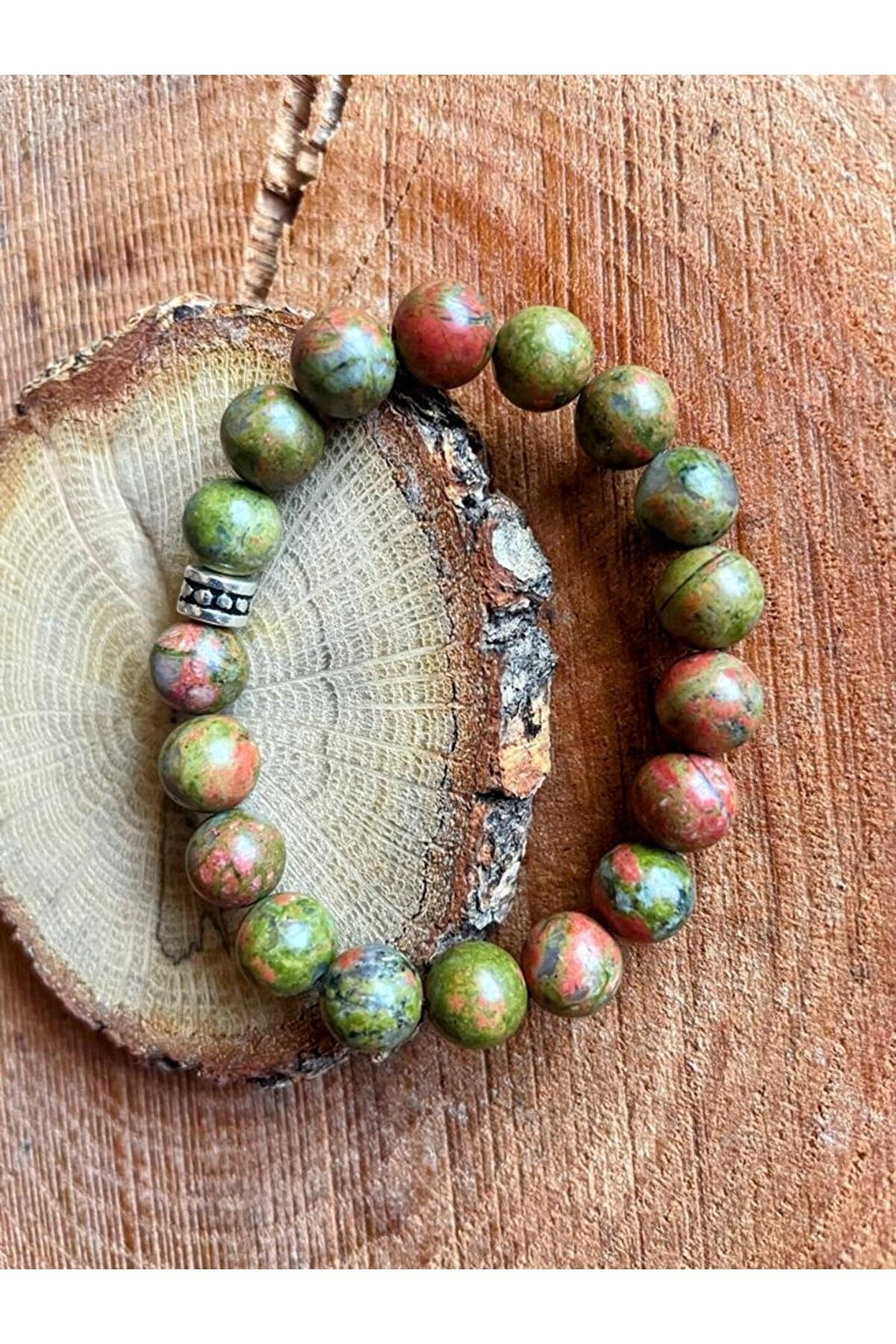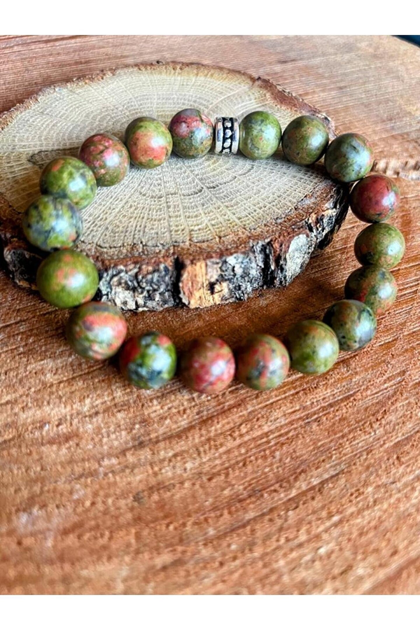 Doğal Unakit taşı kullanılarak üretilmiş, şıklığı ve doğallığı bir arada sunan bileklik; Her bir bileklik, benzersiz desenleri ve renkleriyle dikkat çeken doğal taşların özgün bir yansımasıdır; El yapımı ve özgün tasarımıyla, her bir bileklik eşsiz bir aksesuar deneyimi vaat eder; Doğal taşların sıcaklığını ve zarafetini bileğinizde hissedin; her kıyafetle uyum sağlayacak bir aksesuar;