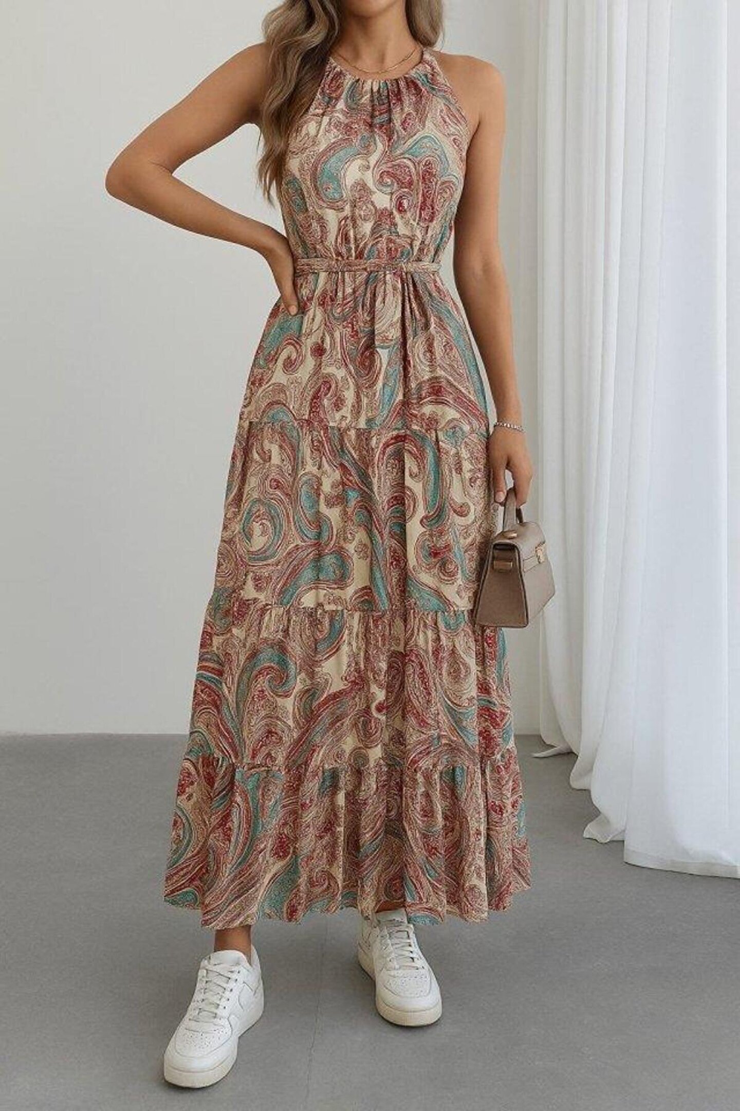 Kadın Halter Yakalı Omuzlardan Açık Kuşaklı Maksi Boy Desenli Süprem Elbise