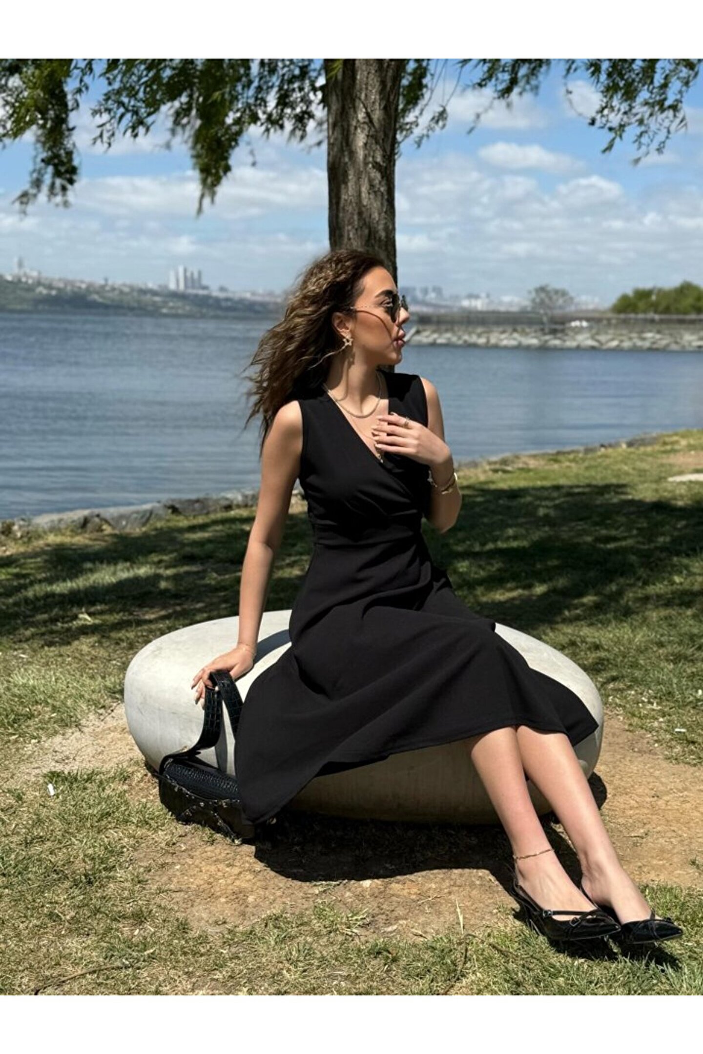 munn collection Kadın Ithal Krep Kumaş Kruvaze Yaka Eteği Kloş Kolsuz Mini Elbise