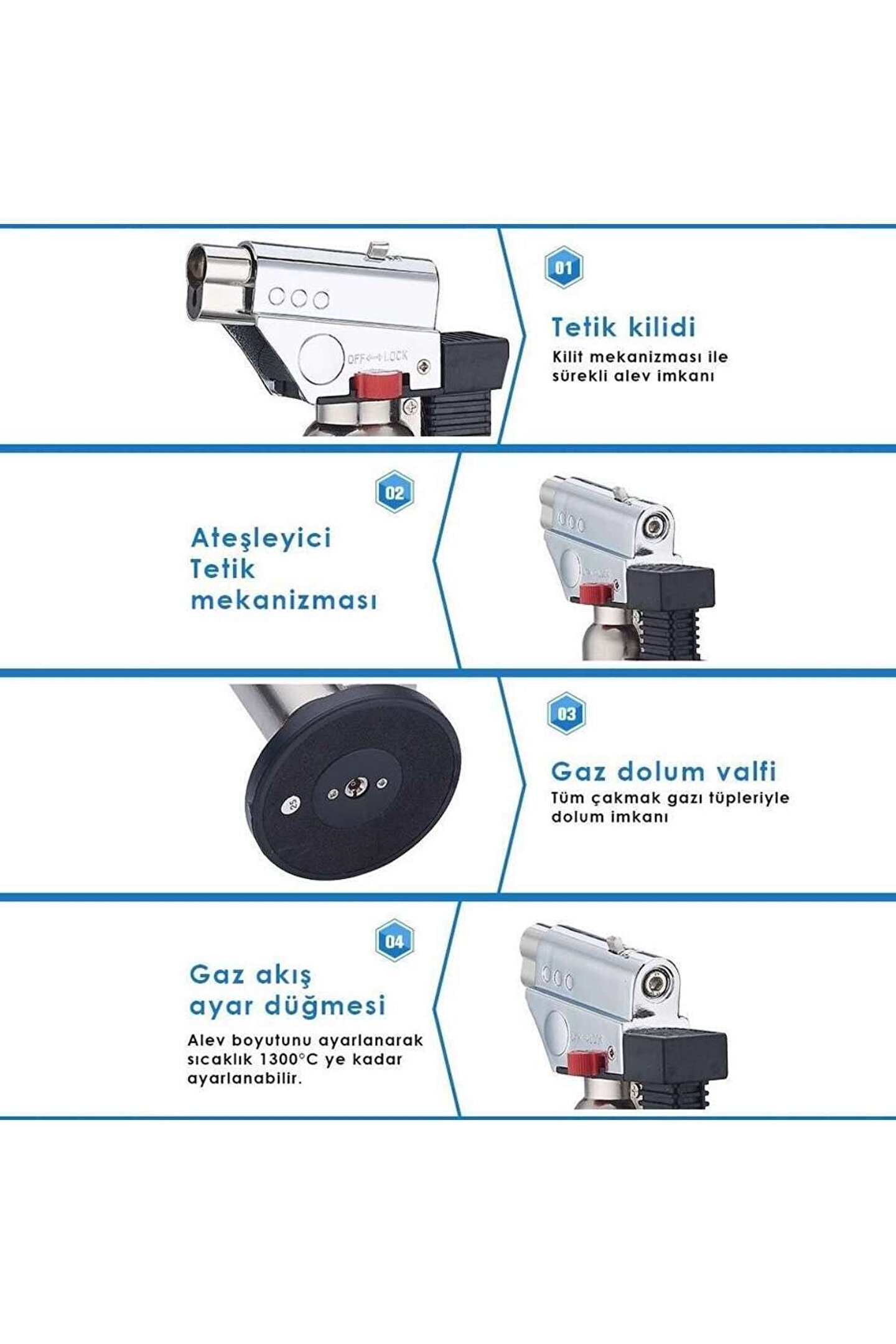 Ürün boyutu yaklaşık 15 cm olup alüminyum kasadan üretilmiştir; 1300 derece sıcaklığa sahiptir; Hobi, dişçilik, mangal, kamp vs; Alanlarında rahatlıkla kullanabileceğiniz bir üründür; Alev sabitleme sayesinde ateşledikten sonra elinizi ateş tuşundan çektikten sonra da pürmüz çalışmaya devam eder; Ateş uzunluğunu ayarlama özelliği ile isterseniz 6; 7 cm civarına kadar ateşin uzunluğunu ayarlayabilirsiniz; Normal gaz dolması sayesinde çok uygun fiyatlara kullanmış olacaksınız; ;;